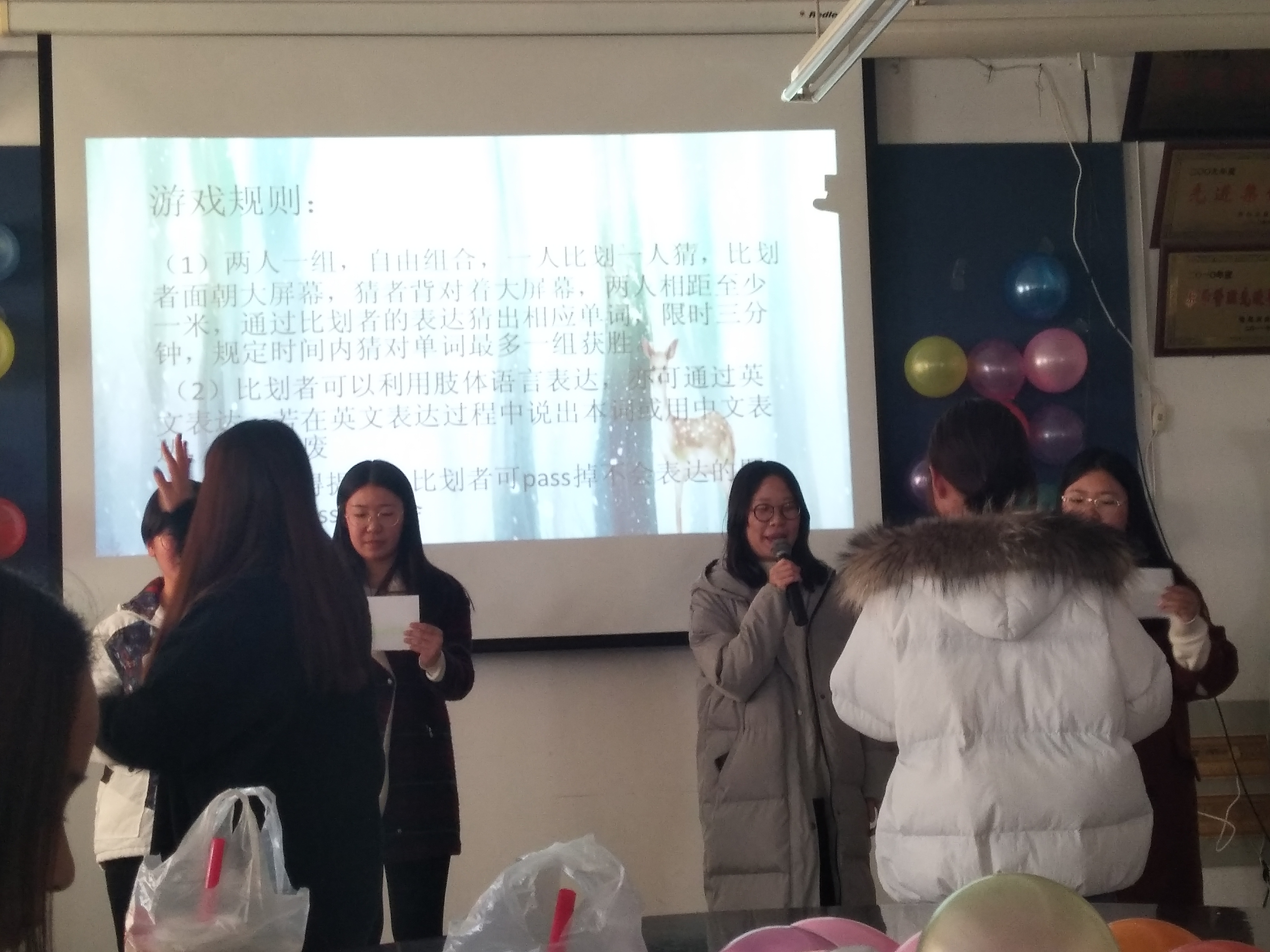 本次大赛共分为“外文歌词你比我猜”、“猜英日韩歌曲”、“外文电影大家猜”、“英文版谁是卧底”四个环节。大赛受到了广泛关注,同学们也都积极踊跃的参加,不仅收获了比赛的快乐,也展现出了当代大学生的青春与智慧。在激烈的四个环节的比拼结束后,获胜的一个小组得到了丰厚的奖品。女生部的成员在此次大赛中积极参加,负责此次大赛的礼仪部分,最后向获奖队员颁发奖品。
