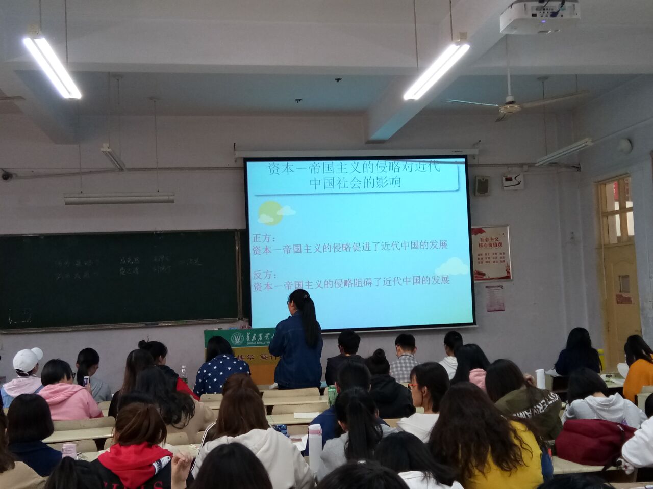 3月30日,青岛农业大学外国语学院英语专业17级学生于教学区中国近现代史课堂上进行辩论赛。此次辩题由英语1701及1702班同学作为正方,辩论“西方列强的侵略促进近代中国的发展”;英语1703及英语1704班同学作为反方,辩论“西方列强的侵略阻碍近代中国的发展”。