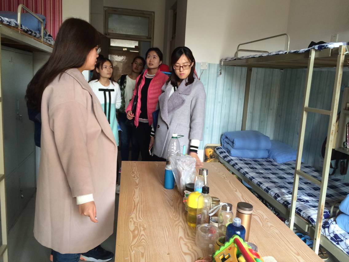 11月13日,外国语学院学生会舍管部在分团委书记王传兴、正科级辅导员刘艳、辅导员刘璐老师和辅导员李晶老师的带领下,联合纪检部、女生部对大一到大四全体宿舍的内务卫生和违禁电器使用情况进行了检查评比。