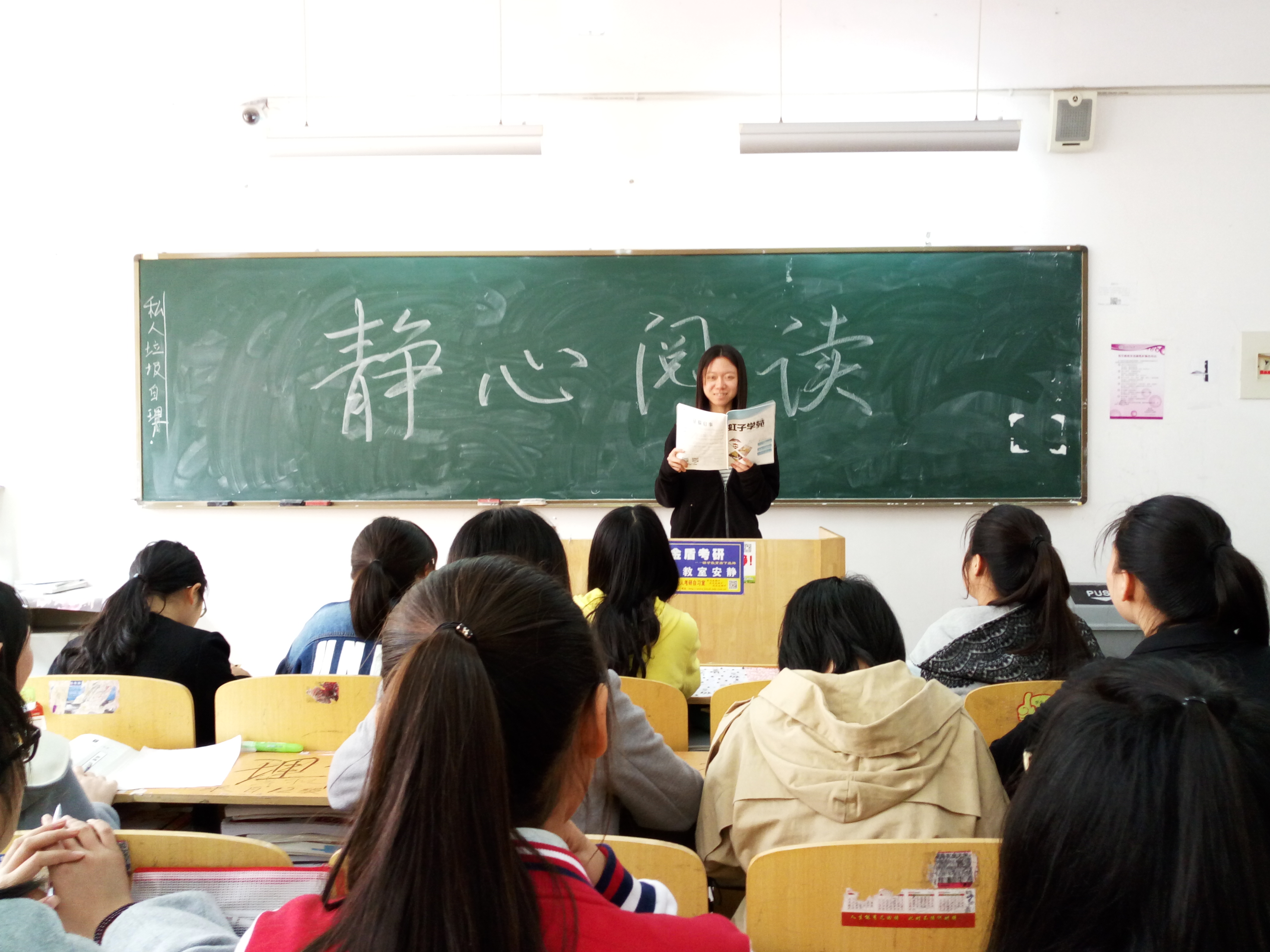 鉴于同学们平时忙于学习、课外活动而无暇放松,外国语学院日语1501班于12月9日在教学区G401开展了一次以“静心阅读”为主题的特殊班会。