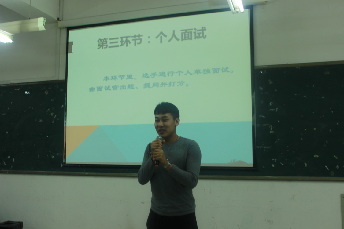此次比赛由学院辅导员和学生会各部部长担任评委。比赛共分为自我介绍、无领导小组面试和个人面试三个环节。比赛开始后,“应聘者”们依次登台,他们个个精神饱满,面对评委犀利的提问冷静思考,或以幽默或以沉着机智应对。当应聘者朴志刚被刁钻的面试官问及自己最大的缺点是什么时,他思索一阵,巧妙地回答道:“我觉得自己最大的缺点就是做事太追求完美。”精彩的表现让观众拍手称赞,现场气氛热烈。