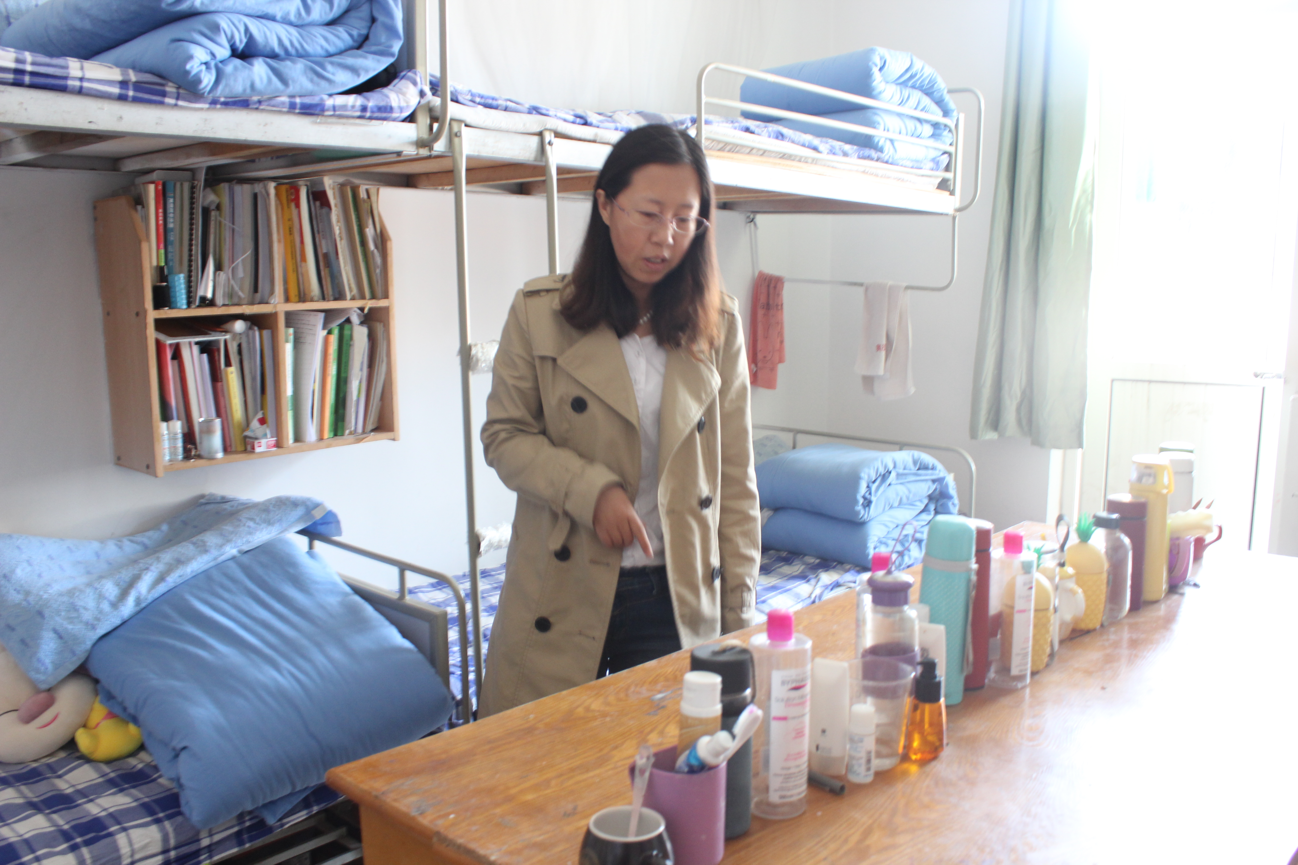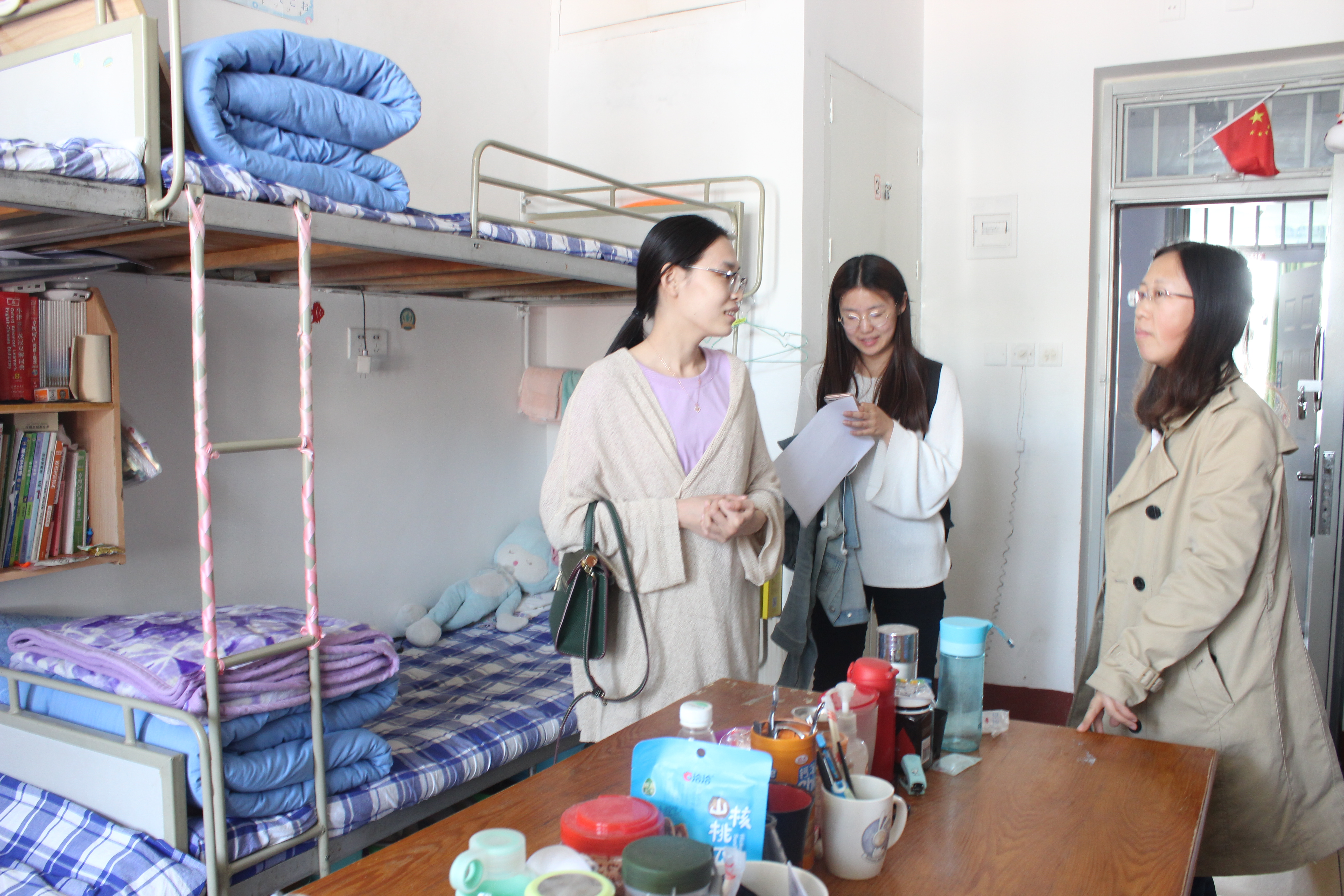 5月9日,外国语学院开展了宿舍卫生检查工作。正科级辅导员刘艳、兼职辅导员李天择、郝云娜进入学生宿舍,学生会部分成员随行,对卫生及安全情况进行检查。