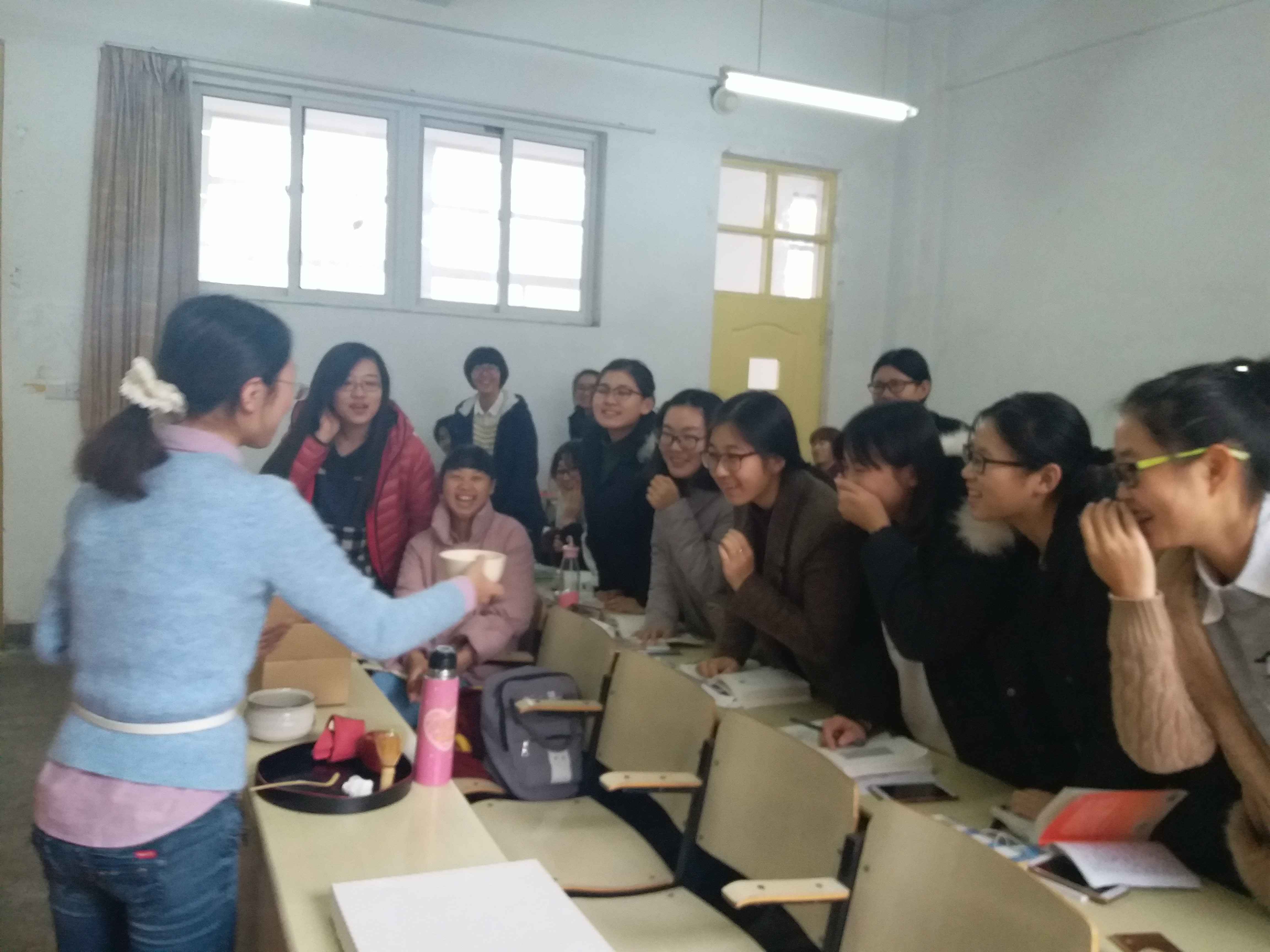 淡粉樱花点缀在方巾上,缓缓折叠,轻轻擦拭茶具,一舒一展,尽显柔美之姿。两勺抹茶粉,少许温开水,用茶筅在茶碗里打匀,白色泡沫附着其上,抹茶在光洁碗壁的照应下愈发显得青绿,清香四溢。王淑一老师一边示范一边讲解,同学们兴致勃勃,争先恐后地要自己尝试一番,好不热闹。