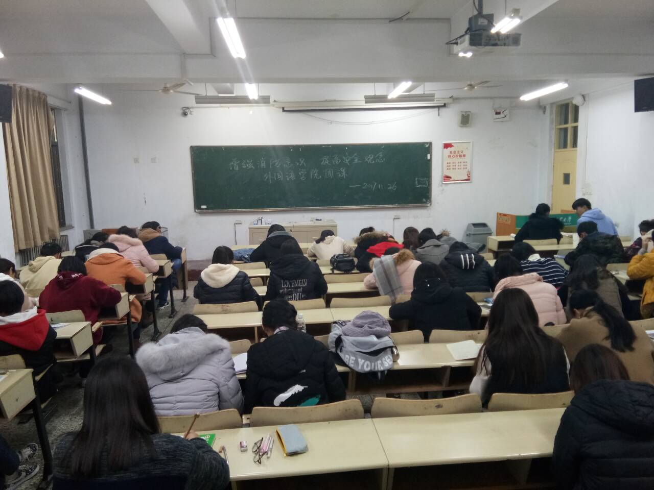 11月26日,外国语学院英语1704班于教学楼开展了以“增强消防意识,提高安全观念”为主题的团课,全班同学按时参加。