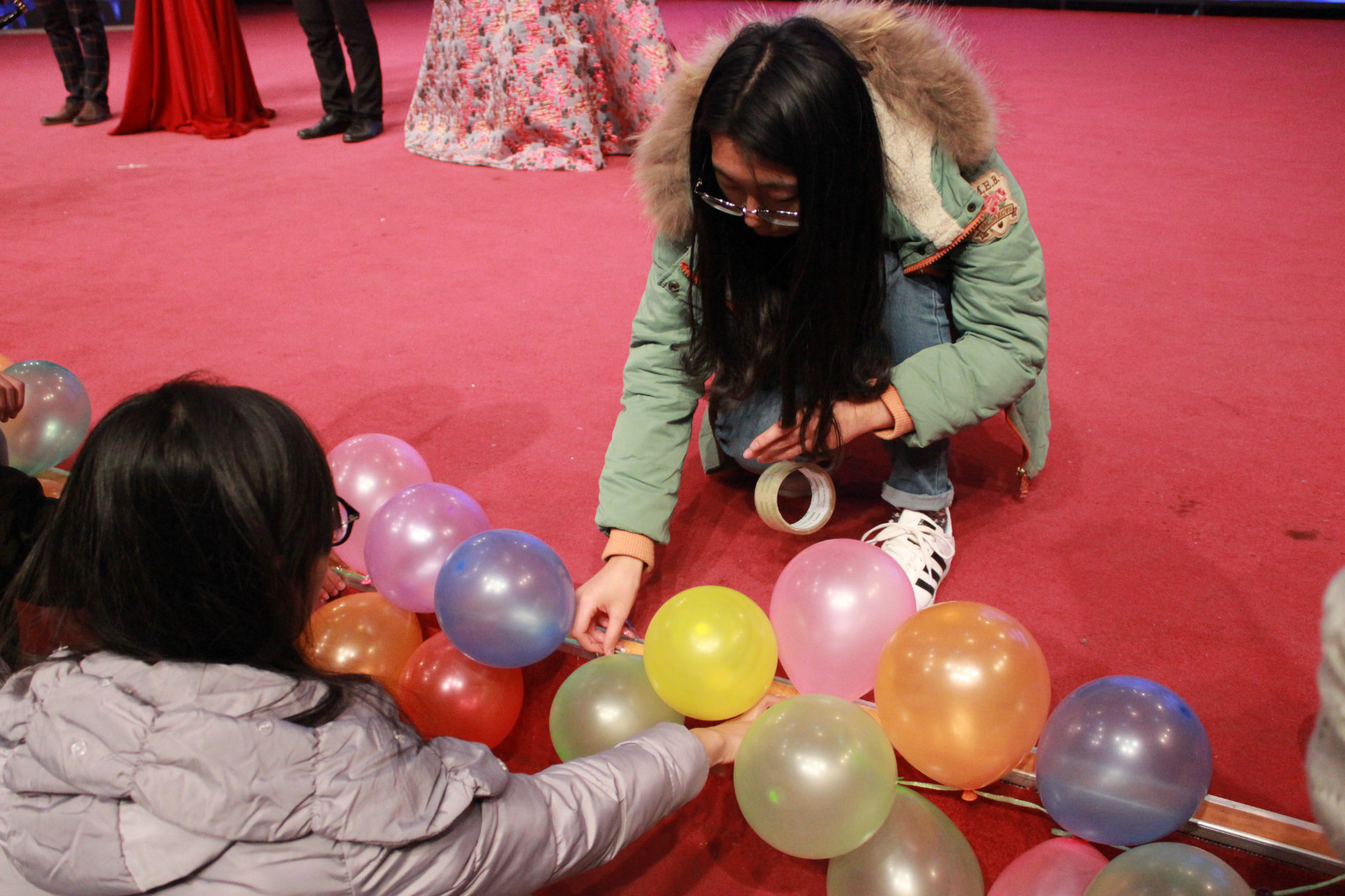 忙碌的身影精心装扮出台上的缤纷色彩,为舞台增添一抹光亮。