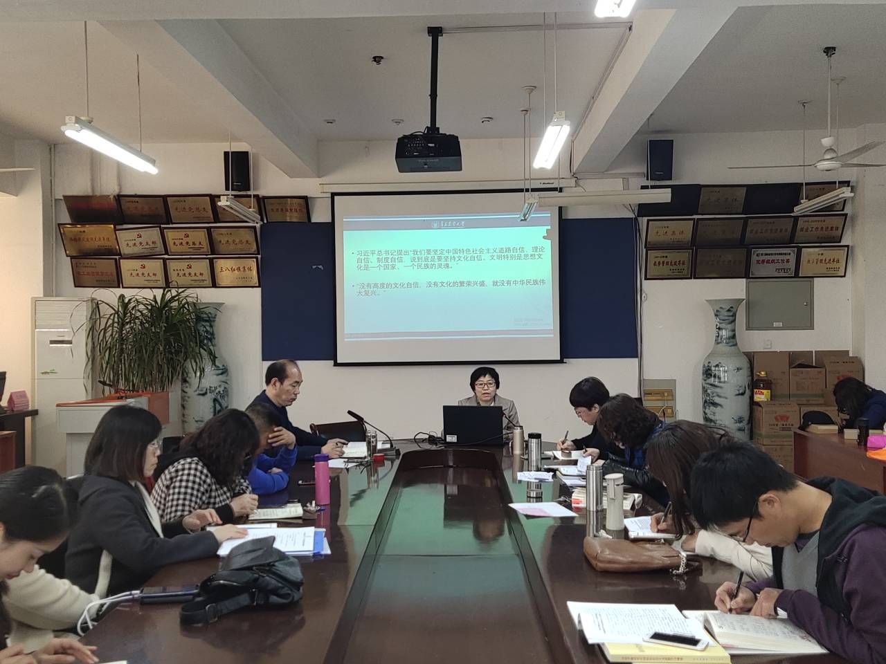 11月21日,外国语学院于文经楼会议室举行”不忘初心、牢记使命”主题教育学习,学院党委书记王仁高主持,学院副院长纪卫宁、副院长高秀雪为全体教职工上专题党课。
