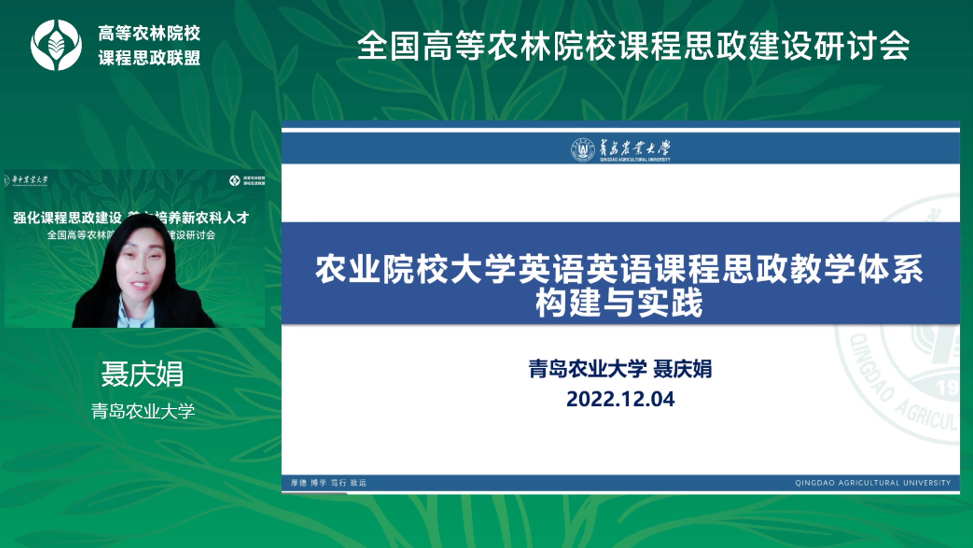聂老师的报告总结凝练了我校大学英语课程思政体系的建设成效,受到与会专家、教师的一致好评,引发了农林院校对构建课程思政建设体系和建设模式的深度讨论,为构建农科院校课程思政建设路径做出了有益探索。