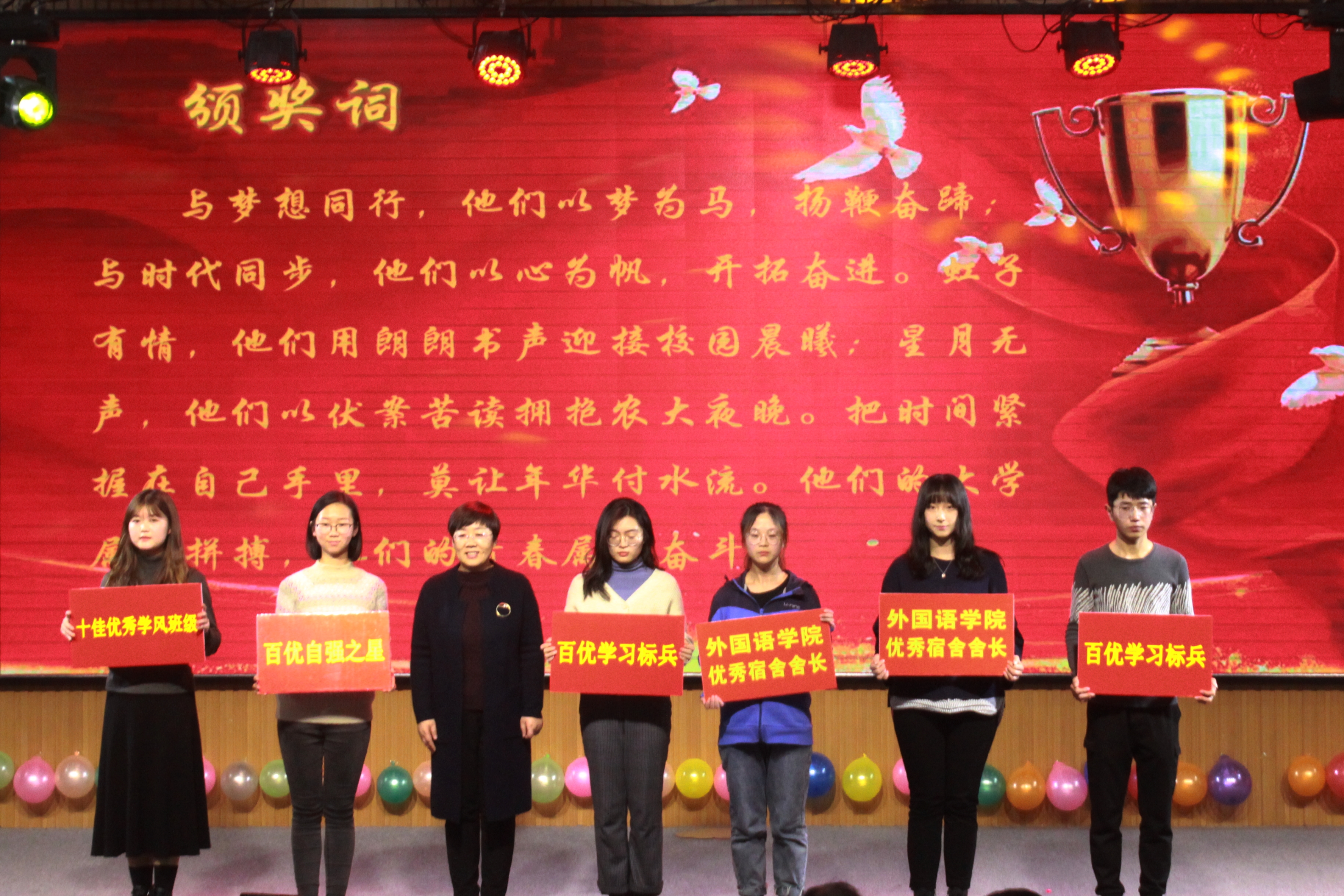 2018-2019学年,外国语学院深入贯彻落实“不忘初心、牢记使命”主题教育精神,在校党委的正确领导下,全体师生脚踏实地,奋发进取,拼搏向上,高扬希望的风帆,用青春点燃激情,用奋斗书写华章,取得了一项又一项令人振奋的成绩。会上,表彰了学院国家奖学金、省政府奖学金获得者等10余项个人奖项,校级先进班级、校级红旗团支部等6项集体荣誉,见证了他们与外国语学院共同取得的丰硕成果。为鼓励学院学生考研深造,学院为2016级考研学生代表颁发考研祝福礼包,在寒冷冬日为他们带来了温暖。