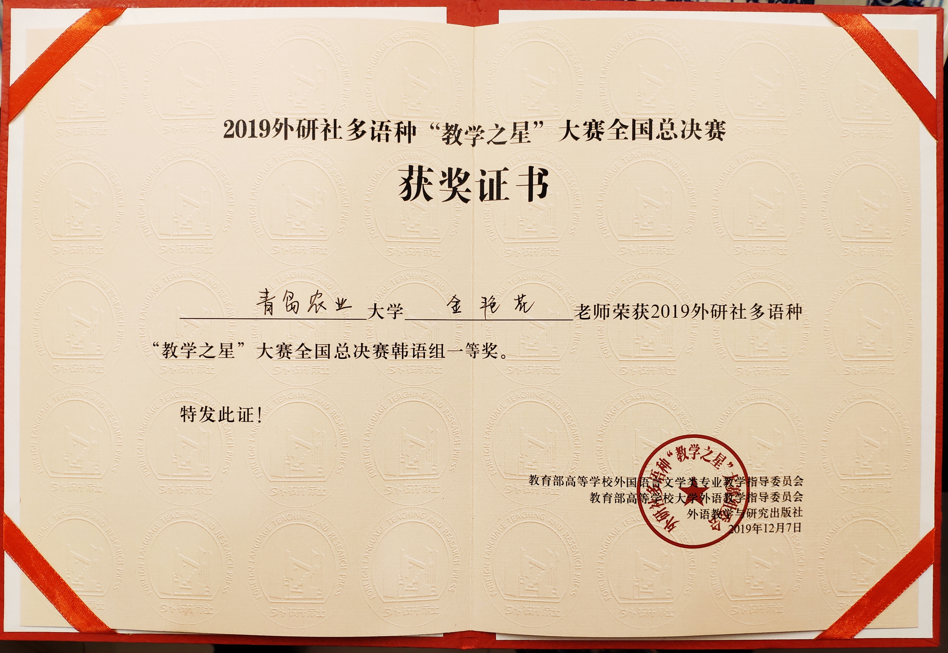 12月7日,2019年外研社多语种“教学之星”大赛全国总决赛在北京落下帷幕,青岛农业大学外国语学院教师金艳花荣获韩语组一等奖。