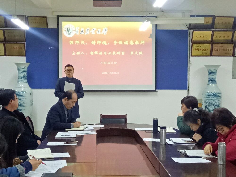 会上,英语专业教研一室教师郭飞和朝鲜语教研室教师李天择分别作了交流发言。郭飞以“何以立师德”为题,引用了古今中外教育名家对师德的阐述,总结归纳出师德是为师之根本,认为教师必须重视师德对学生的影响,在教育教学工作中,不仅要自身恪守师德规范,更要做到知行合一,把对师德的认知转化为实实在在的行动。李天择以“强师风,铸师魂,争做满意教师”为题,结合全国教育大会有关精神,就师德师风建设谈了自己的感悟。他认为,立德树人是教师在从事教育工作过程中最根本、最首要的工作,作为教师,要在教育教学工作中以身作则、言传身教,以自身的言行去影响教化学生,把立德树人落到实处。他特别结合自身留学经历和在教学方法上的改进实例,讲述了树立良好的师德师风应如何从自身做起,从教育教学实际工作做起。