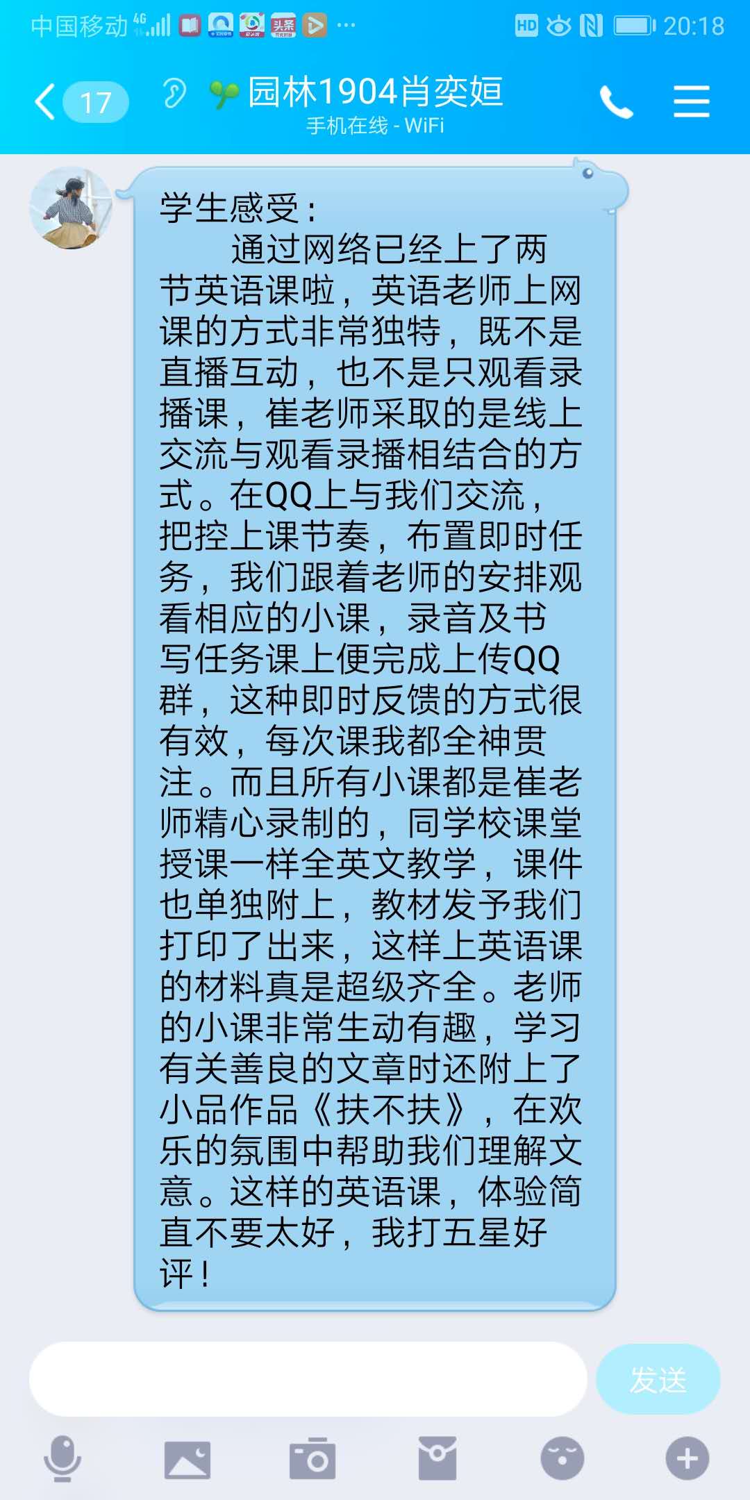 学生也积极进行了教学效果的反馈。2019级的肖奕姮同学说道:英语老师上网课的方式非常独特,采取的是线上交流和录播相结合的方式,每次课我都全神贯注,线上的资料也超级齐全,课堂生动有趣,在欢乐的氛围中帮助我们理解了文意,这样的英语课,体验简直不要太好,我打五星好评!