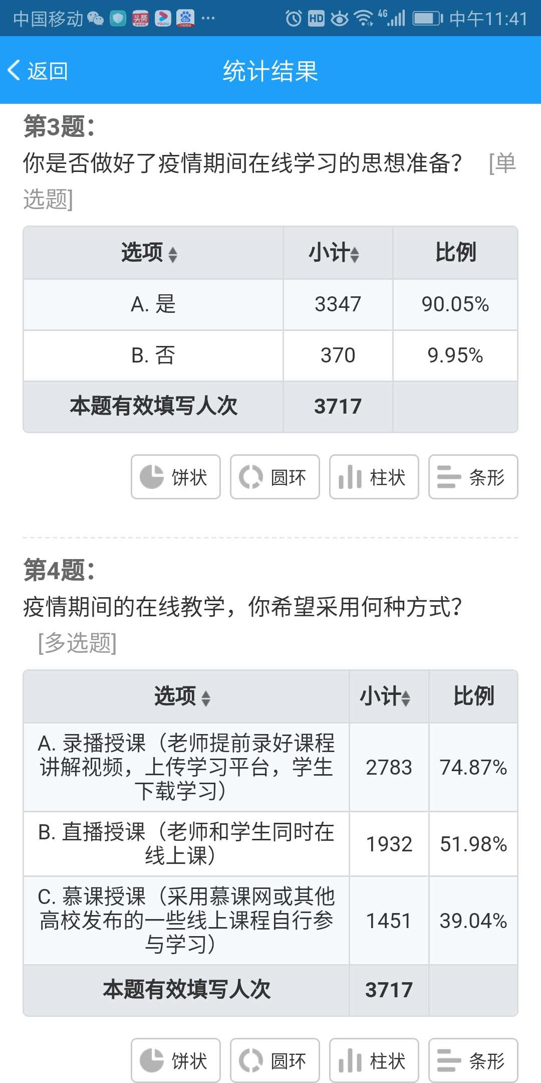 为有效了解学生对于突如其来的大面积网络课程的学习态度及接纳情况,大学英语教研室的李卿、霍兴花老师组织开展了学生对于网络学习的问卷调查,约3700余名2019级非英语专业学生参与了问卷调查,为有效开始网络教学打下了坚实基础。问卷结果显示,90%的同学做好了开始网络课程的心理准备,非常期待网络课程的开始,90%的同学使用手机进行学习,部分学生对于网络课程的线上形式和上课的方式提出了许多宝贵的建议和意见。