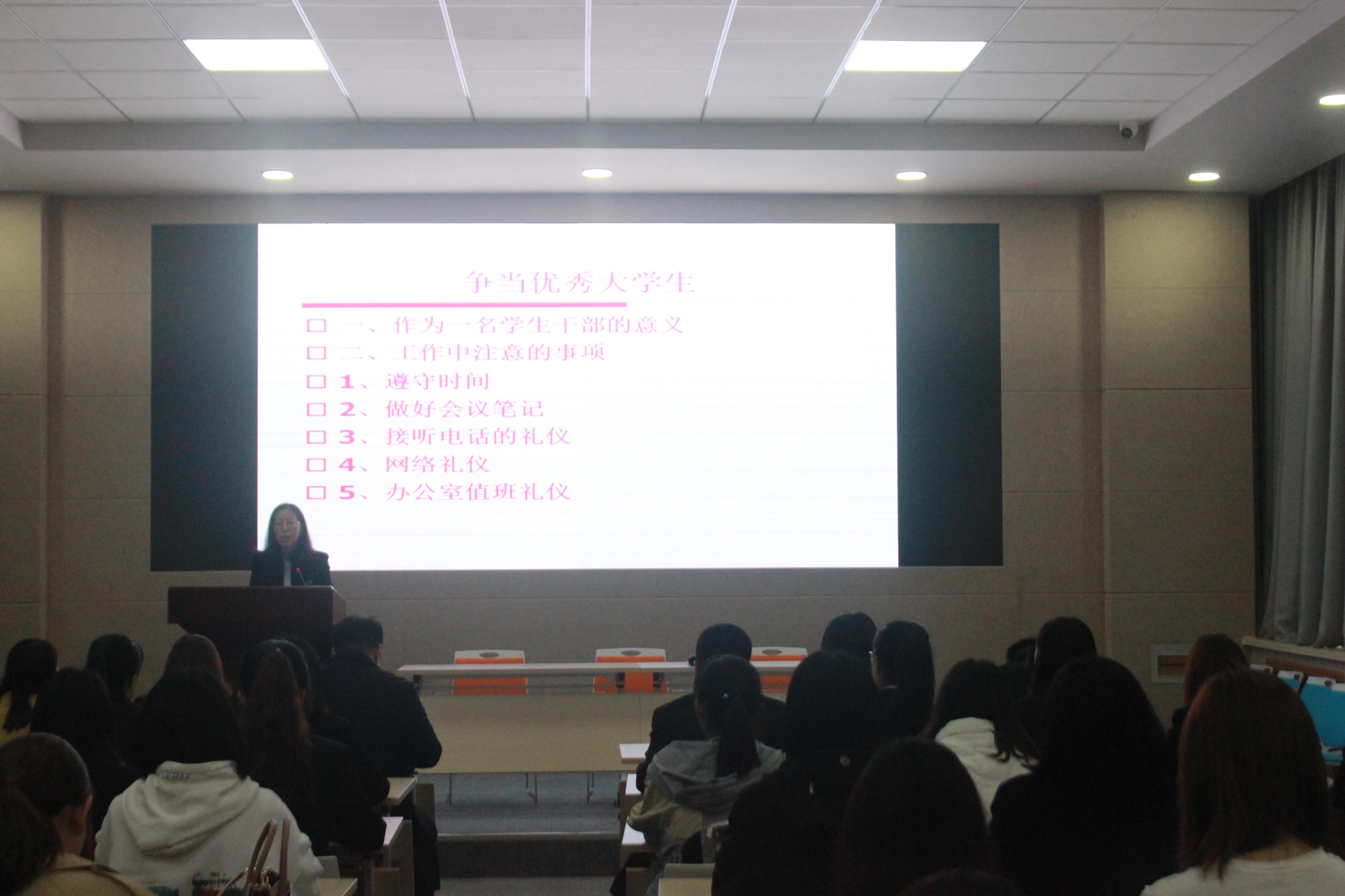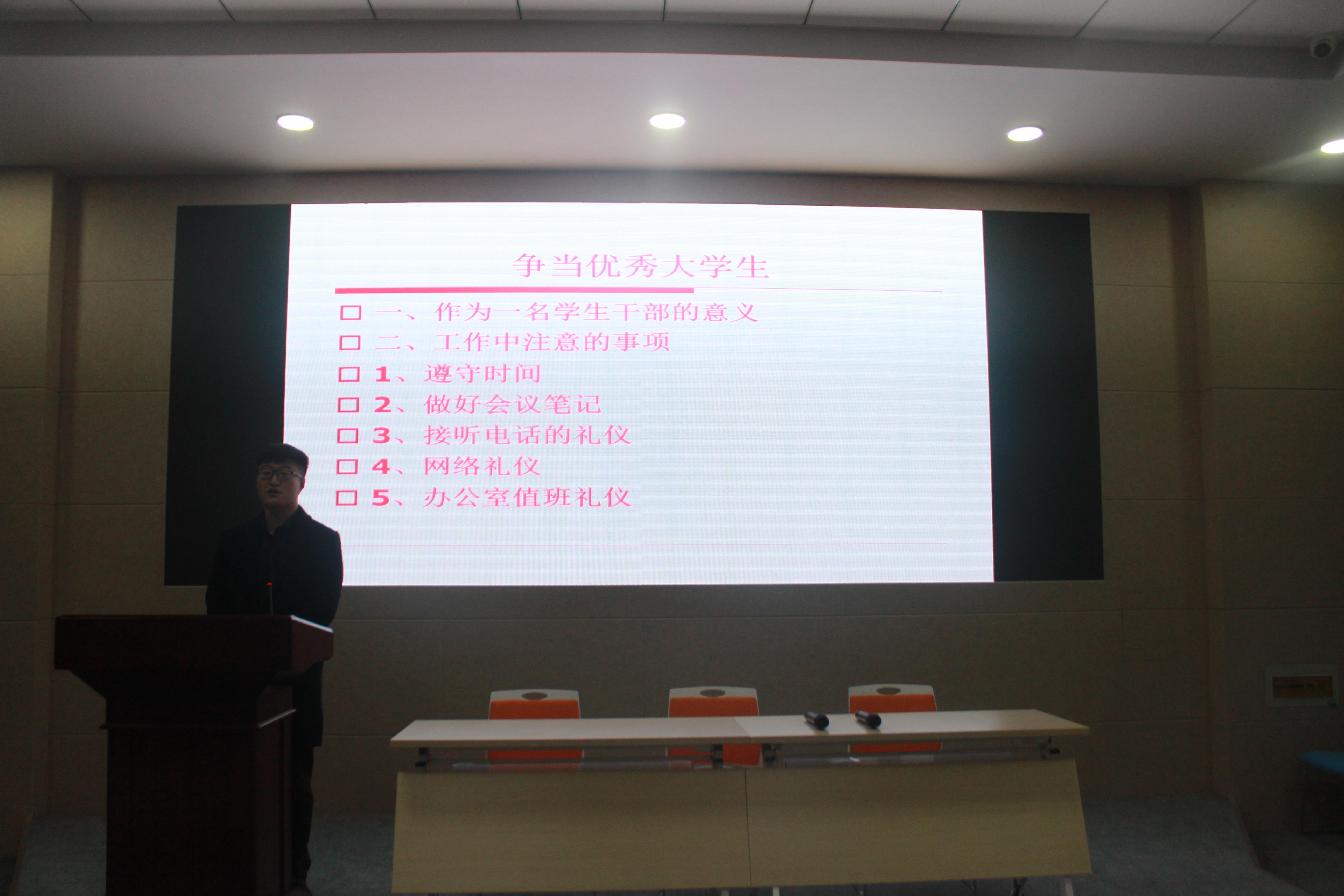 刘艳以“争当优秀大学生”为题做了专题报告,她围绕作为一名学生干部的意义、工作中需要注意的事项展开培训。强调了学生干部应严格遵守时间、随时做好会议记录、接听电话要注意礼仪、做好网络礼仪和办公室值班礼仪,并衷心地希望大家能够学有所获,学有所得,向更高的目标奋进,实现自己的人生梦想。