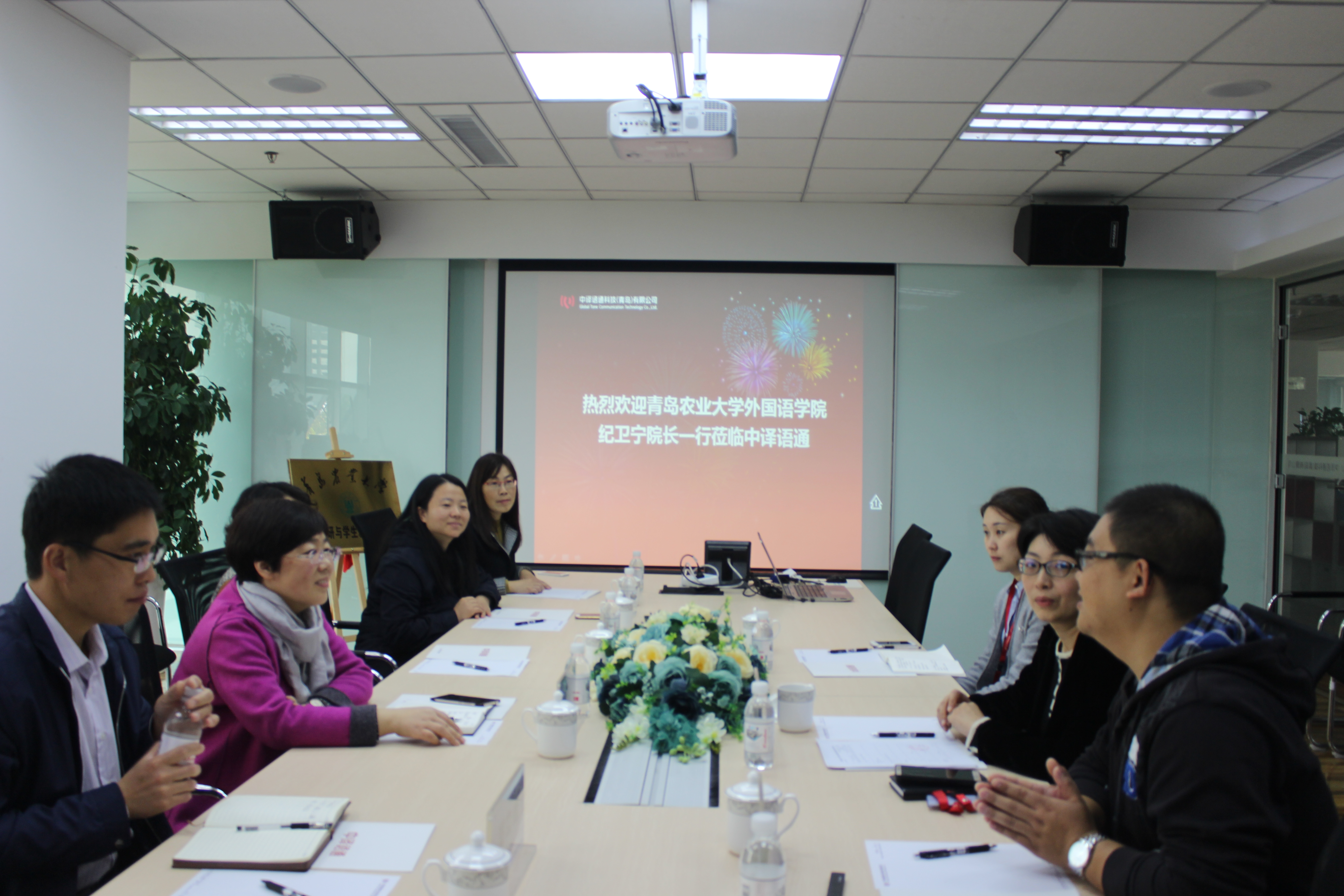 签约会上,张慧介绍了中译语通科技(青岛)有限公司的基本情况、在语言服务和语言大数据方面取得的成就、以及先期与部分院校的合作情况。纪卫宁详细介绍了青岛农业大学外国语学院的学科建设、师资队伍建设、人才培养理念及培养质量、创新创业教育现状等方面的情况,并就双方合作的领域提出了一些具体设想。随后,双方重点围绕本科生专业实习和实践、应用型翻译人才培养、翻译项目合作、农业科技英语翻译与数据库建设、学生创新创业实践、师资合作等领域进行了深入交流和探讨,并达成了合作意向。张慧表示近期将到外国语学院回访。