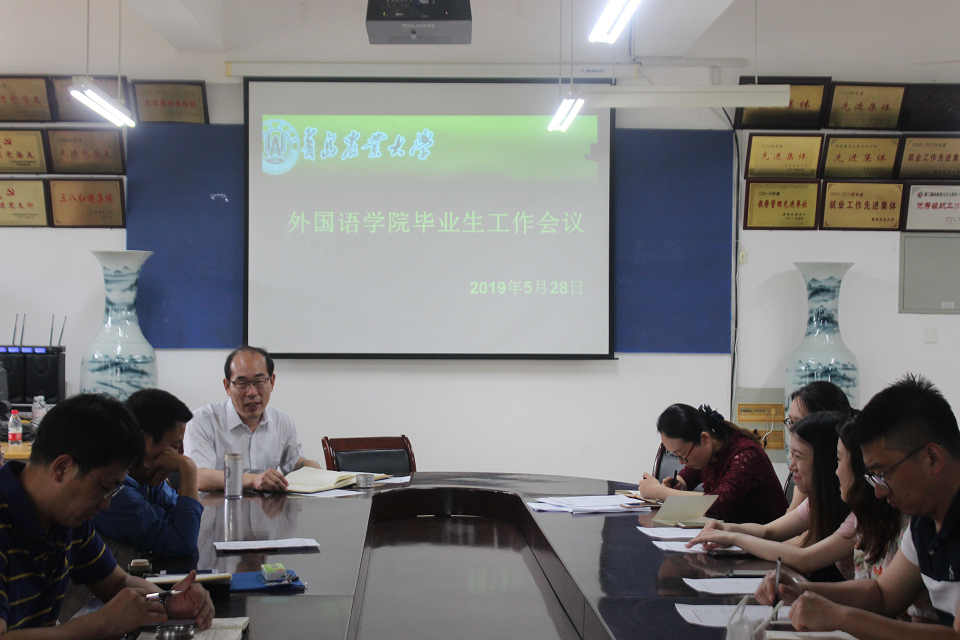 5月28日,青岛农业大学外国语学院于文经楼会议室召开毕业生工作会议,会议由学院党委书记王仁高主持,学院团委书记嵇安奕、正科级辅导员刘艳、2019届毕业班班主任、班长和团支书参会。