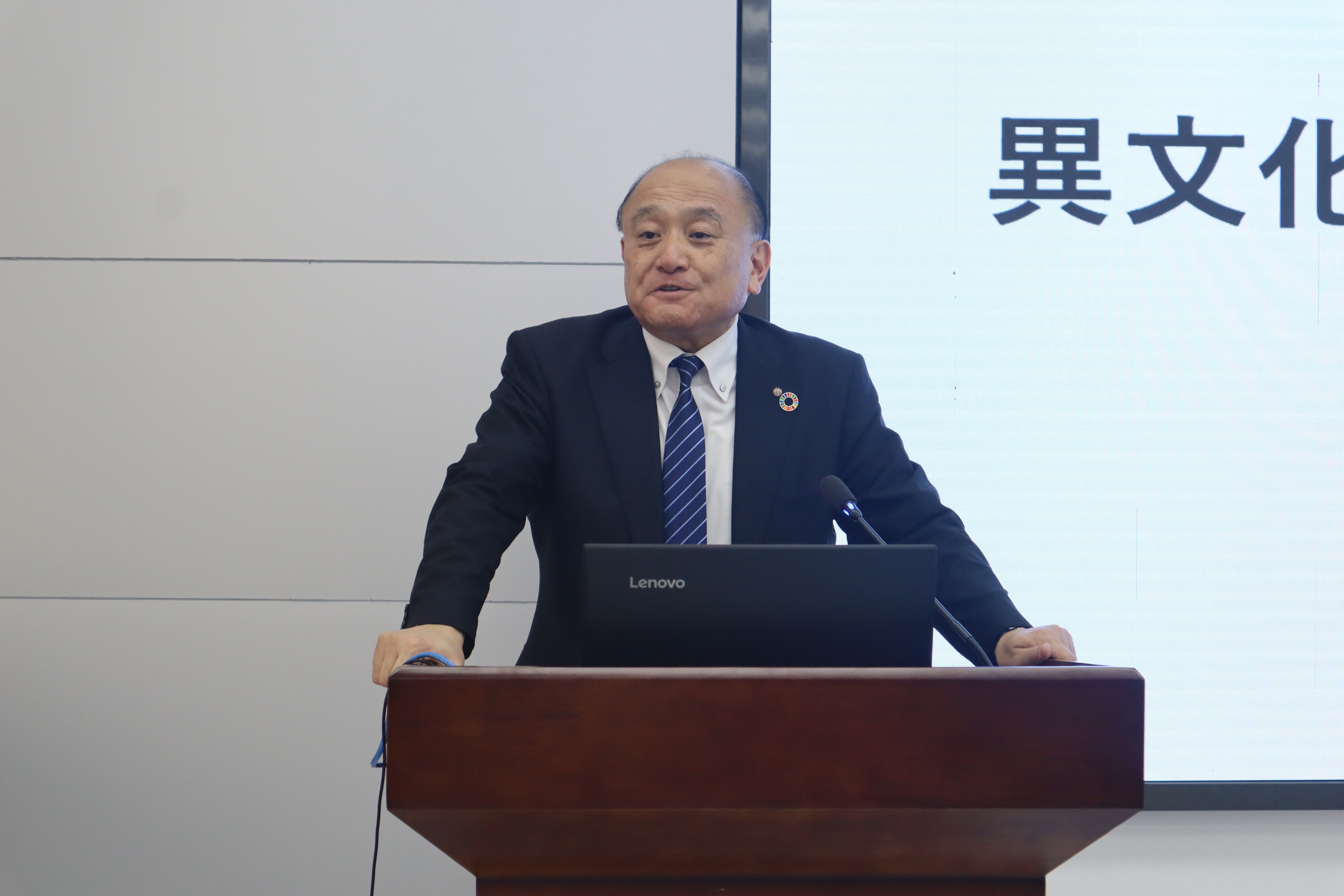 仓林真砂斗以《异文化与自文化的认知》为主题开展讲座。他结合自身赴中国访问经历,以幽默风趣的方式讲解了中日文化的异同。