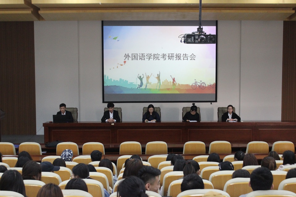 4月19日,青岛农业大学外国语学院于学术会馆举行考研报告会。考取2019年硕士研究生的陆梦佳(扬州大学英语笔译专业)、邓康达(华东政法大学法律硕士专业)、孙雪莲(上海师范大学比较教育学专业)、邱文超(中国社会科学院大学法律硕士)、梁淑曦(青岛科技大学翻译硕士)五名2015级学生应邀分享考研经验,学院学生代表200余人参加。报告会由辅导员刘艳主持。