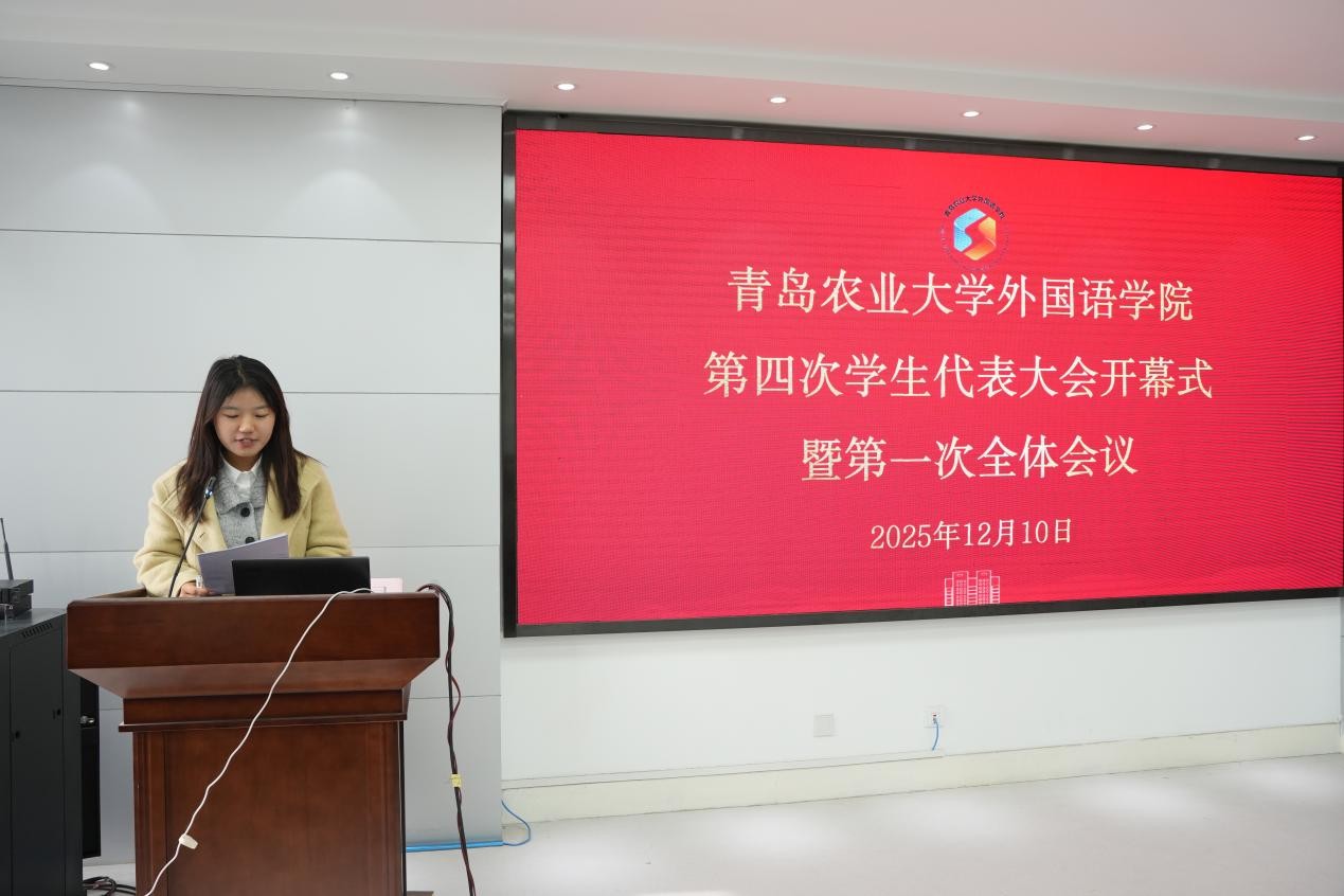 2025届学生会主席团成员于爽宣读了《关于同意召开青岛农业大学外国语学院第四次学生代表大会的批复》。学生会主席团成员张溪芮代表青岛农业大学外国语学院第三届学生会作工作报告,全面总结了学院学生会在过去一年的各项工作及取得的成绩,指出不足,并表示新一届成员将传承作风、弥补短板,扎实推进服务同学与学院发展工作。