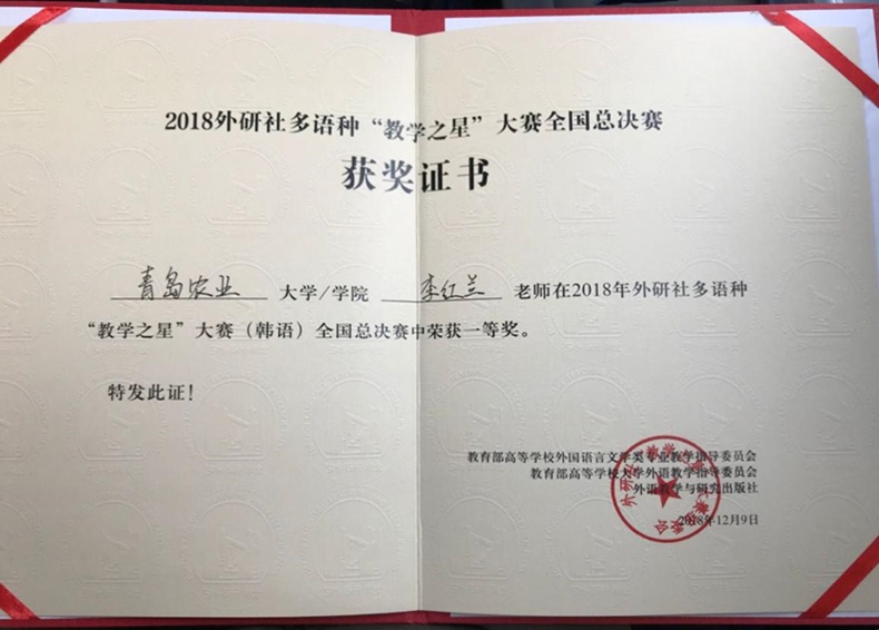 12月9日,2018年外研社多语种“教学之星”大赛全国总决赛在北京落下帷幕,青岛农业大学外国语学院教师李红兰荣获韩语组一等奖,再次刷新了学院在该奖项获奖的纪录。