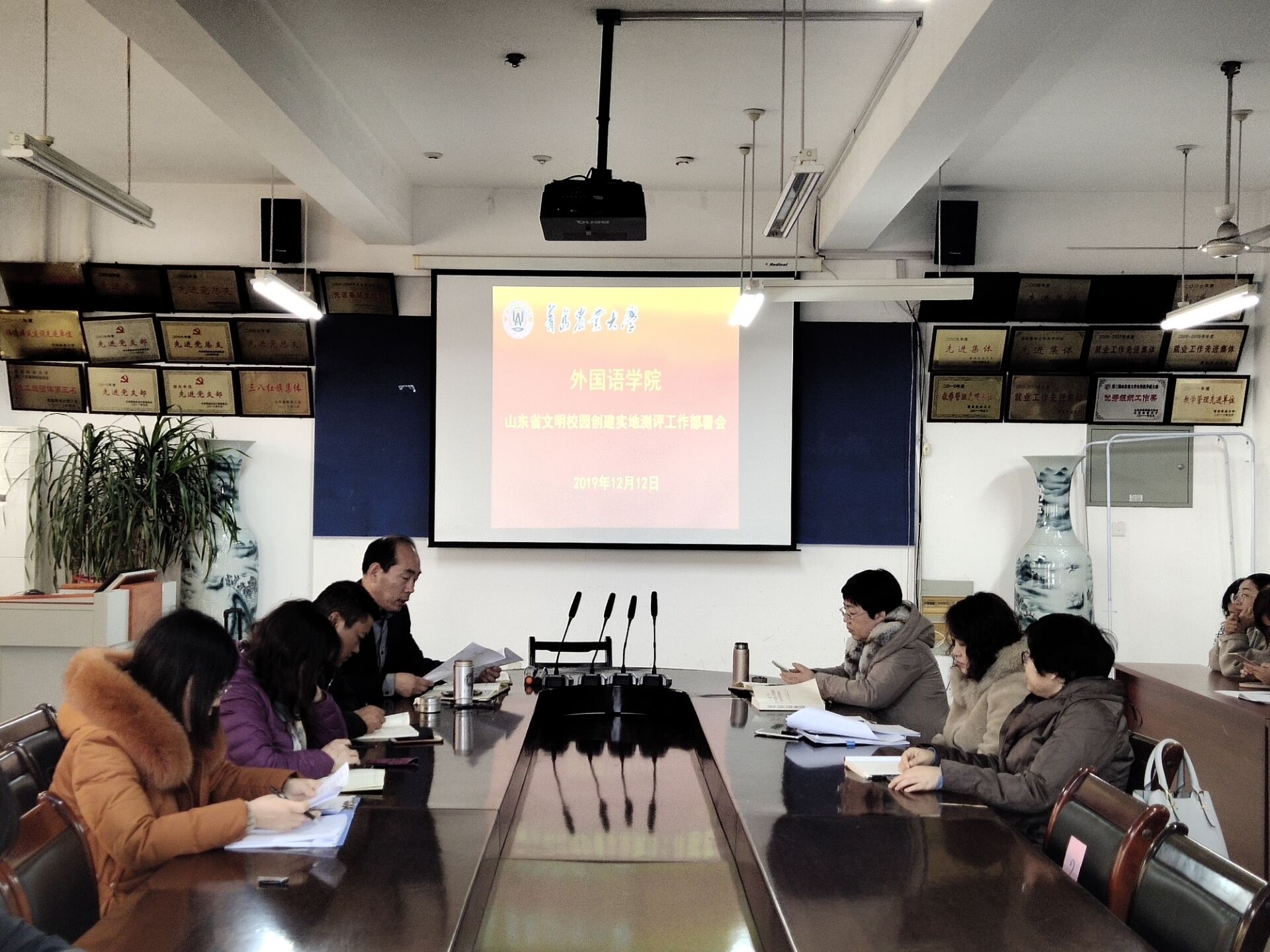 12月12日,青岛农业大学外国语学院于文经楼会议室举行十九届四中全会精神学习交流会,会议由学院党委书记王仁高主持,全体教职工参加。