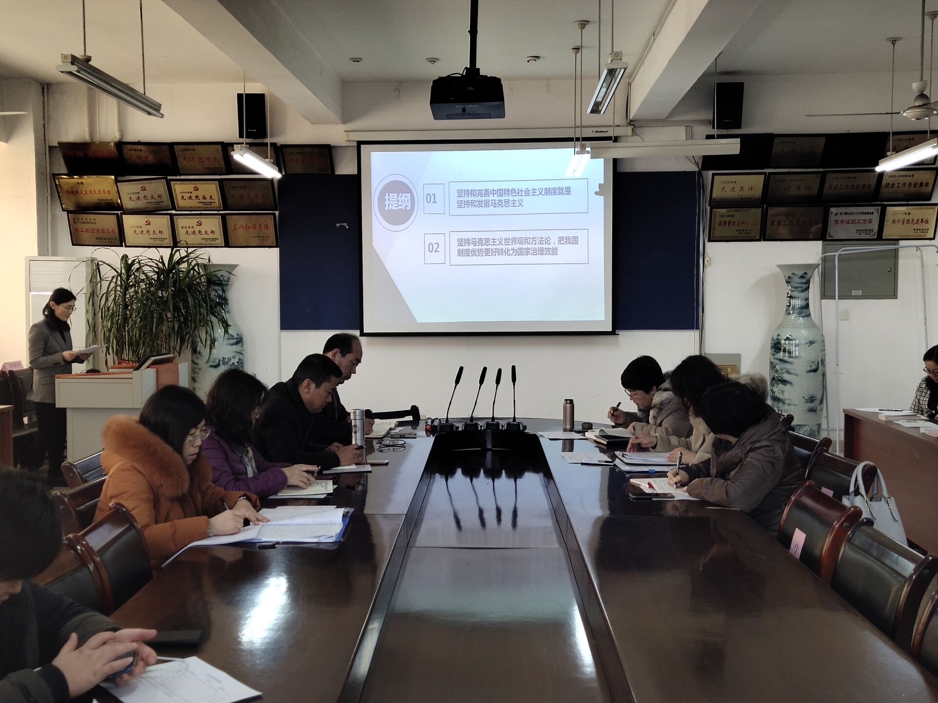 教师王竹青以“坚定的制度自信推进中国特色社会主义建设”为主题交流了十九届四中全会精神学习体会,围绕坚持和完善中国特色社会主义制度就是坚持发展马克思主义,坚持马克思主义世界观和方法论把我国制度优势更好转化为国家治理效能两方面做了交流发言。