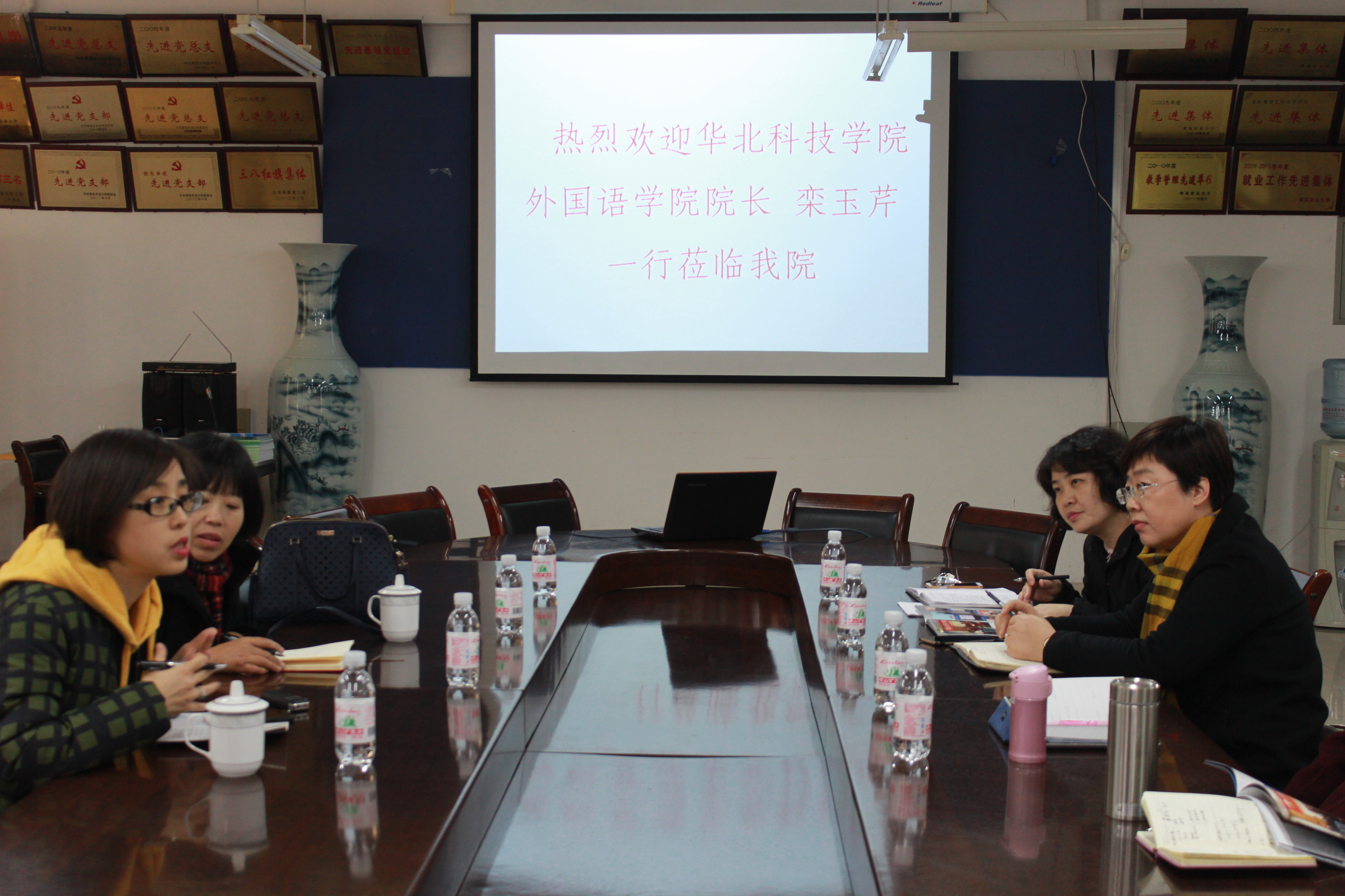 11月29日,华北科技学院外国语学院院长栾玉芹一行到外国语学院走访交流。副院长纪卫宁、李春梅、各专业负责人等在学院会议室与来访客人进行了座谈交流。