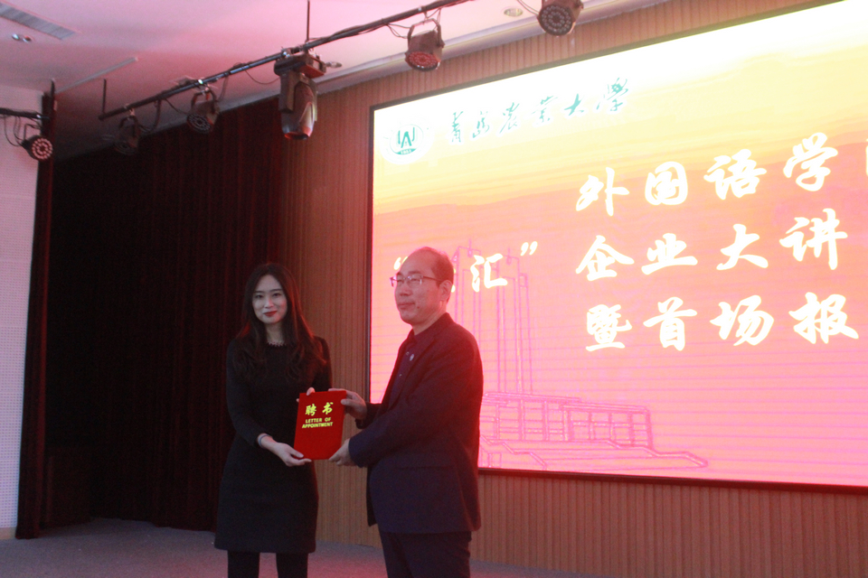 启动仪式上,学院党委书记王仁高为青岛优创公司人力资源经理郭慕瑶颁发了讲师证书。聘请郭慕瑶女士为外国学院企业大讲堂讲师,聘期为一年。