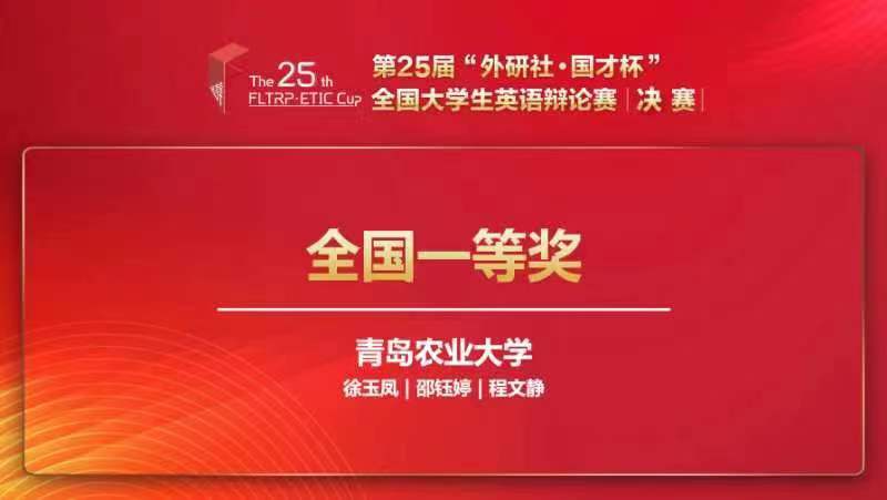 2023年6月10日至11日,第25届“外研社·国才杯”全国大学生英语辩论赛决赛完成了线上赛的比拼,本次决赛共有来自全国的145支参赛队伍参加。青岛农业大学外国语学院英语系主任徐玉凤指导的英语专业学生邵钰婷、程文静获得本次英语辩论赛全国决赛国家级一等奖,这是我校在参加这一赛事以来取得的最好成绩,实现了外语二类竞赛国家级一等奖的突破,也是山东省唯一获得国家级一等奖的高校。