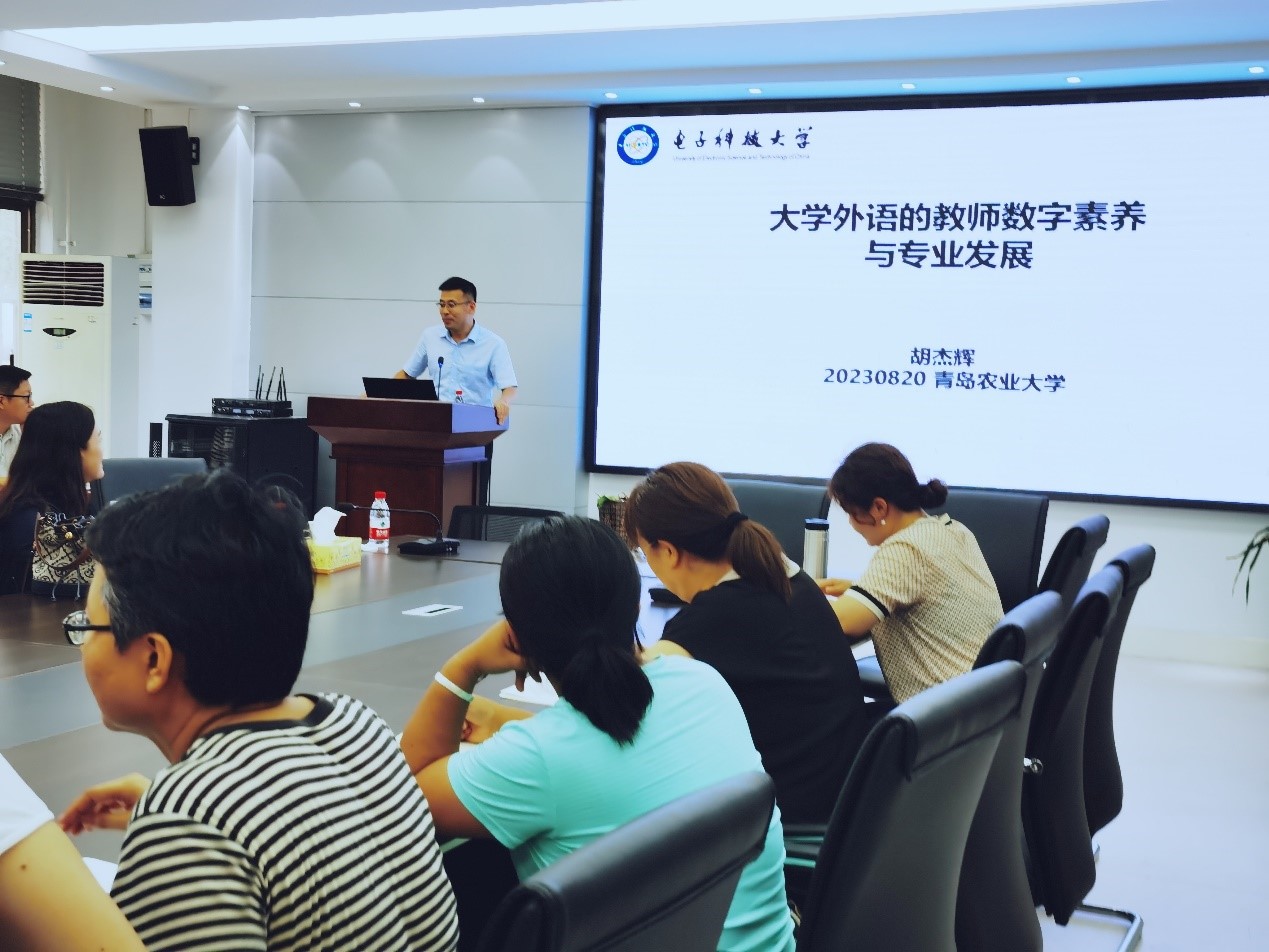2023年8月20日下午,外国语学院“高水平团队建设”活动邀请了电子科技大学外国语学院院长、博士生导师胡杰辉教授为外国语学院全体教师带来了一场主题为《大学外语教师的数字素养与专业发展》的学术讲座,讲座由副院长李春梅主持。