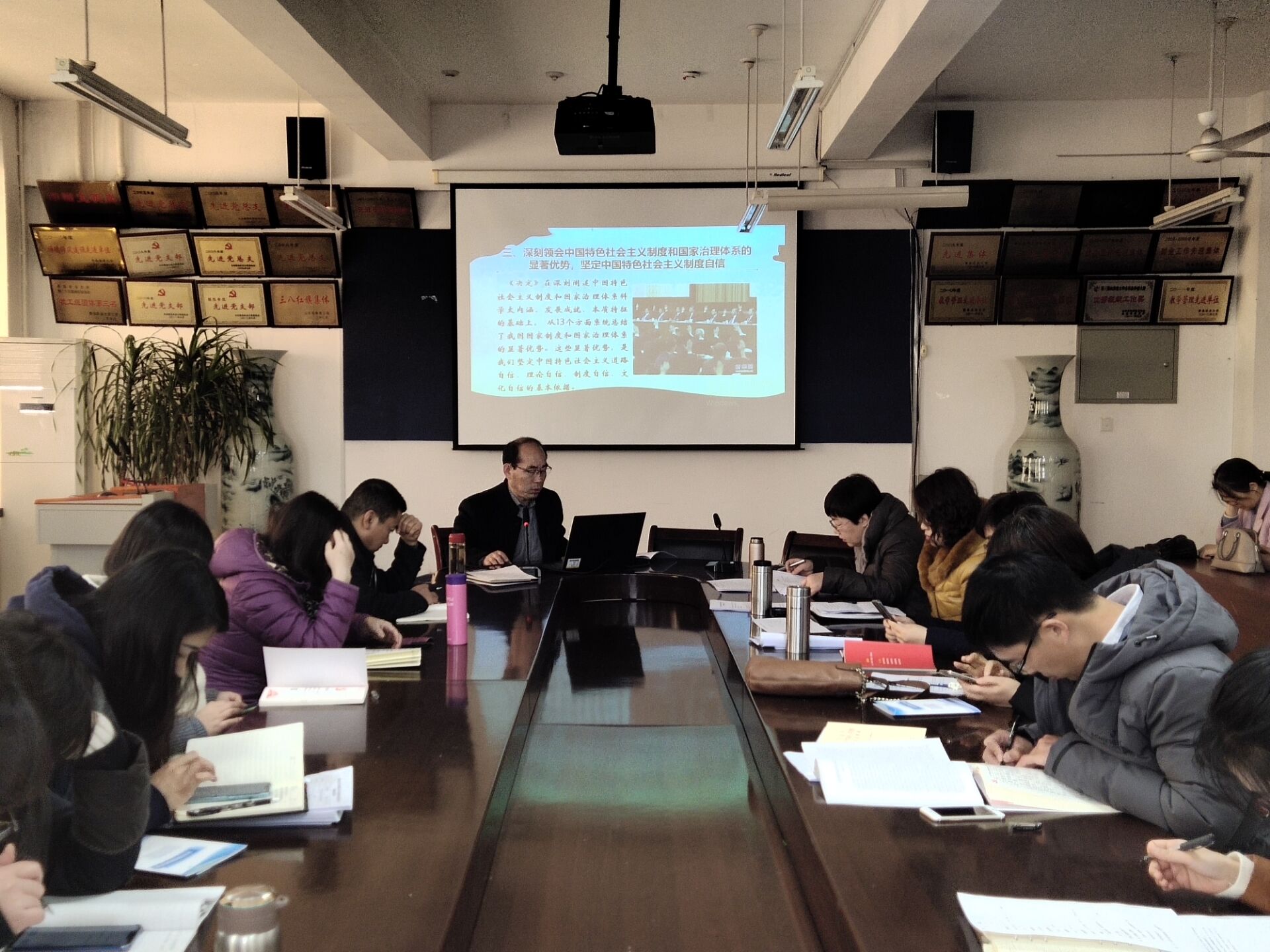 最后,王仁高对全院教师学习贯彻党的十九届四中全会精神提出四点具体要求:一是要充分认识中国特色社会主义制度的本质特征和优越性;二是要充分认识中国特色社会主义制度建设和国家治理能力建设取得的历史性成就;三是要充分认识我们已经走出了一条国家制度和国家治理体系、治理能力建设的成功之路;四是要充分认识西方意识形态渗透的现实危险和危害,坚决反对照搬照抄西方制度模式。