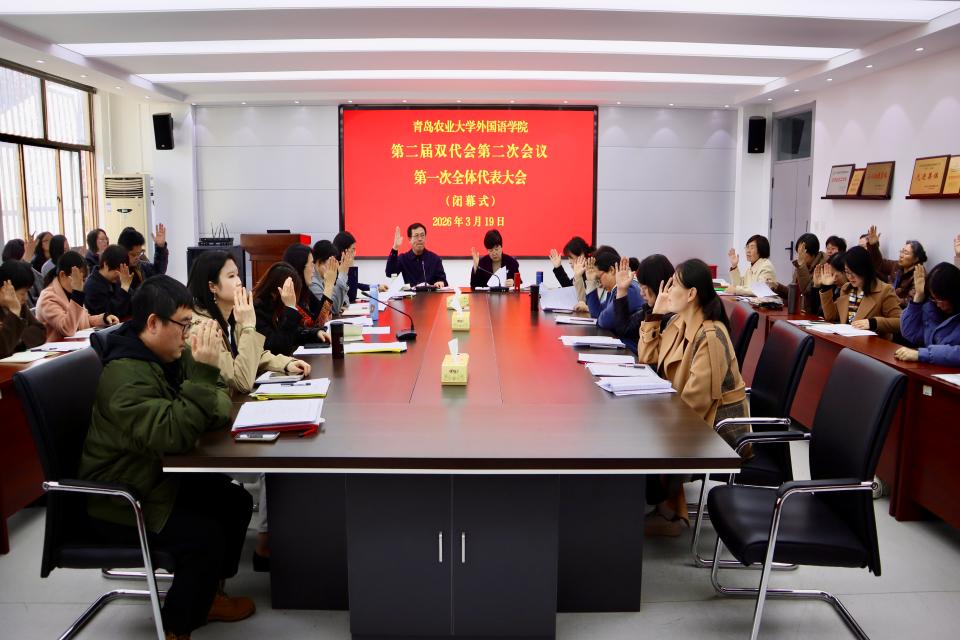 闭幕式上,大会表决通过外国语学院工作报告、工会工作报告等各项决议。王晓雷作总结讲话并致闭幕词,并激励全体教职工:一是要在“落实”二字上见真章,夯实发展根基,把立德树人融入教育教学各环节,把科研和教学常规做细、把课程建设做实、把学生指导做精。二是要在“融合”二字上求突破,激活创新动能,要主动拥抱变革。要积极探索人工智能赋能外语教学的新路径。三是要在“同心”二字上聚合力,讲好外院故事,要加强协同攻关,在教学科研中相互支撑、共同成长,师生之间要教学相长,营造包容、开放、进取的学院氛围,用外语讲好中国故事、山东故事、青岛农大故事。