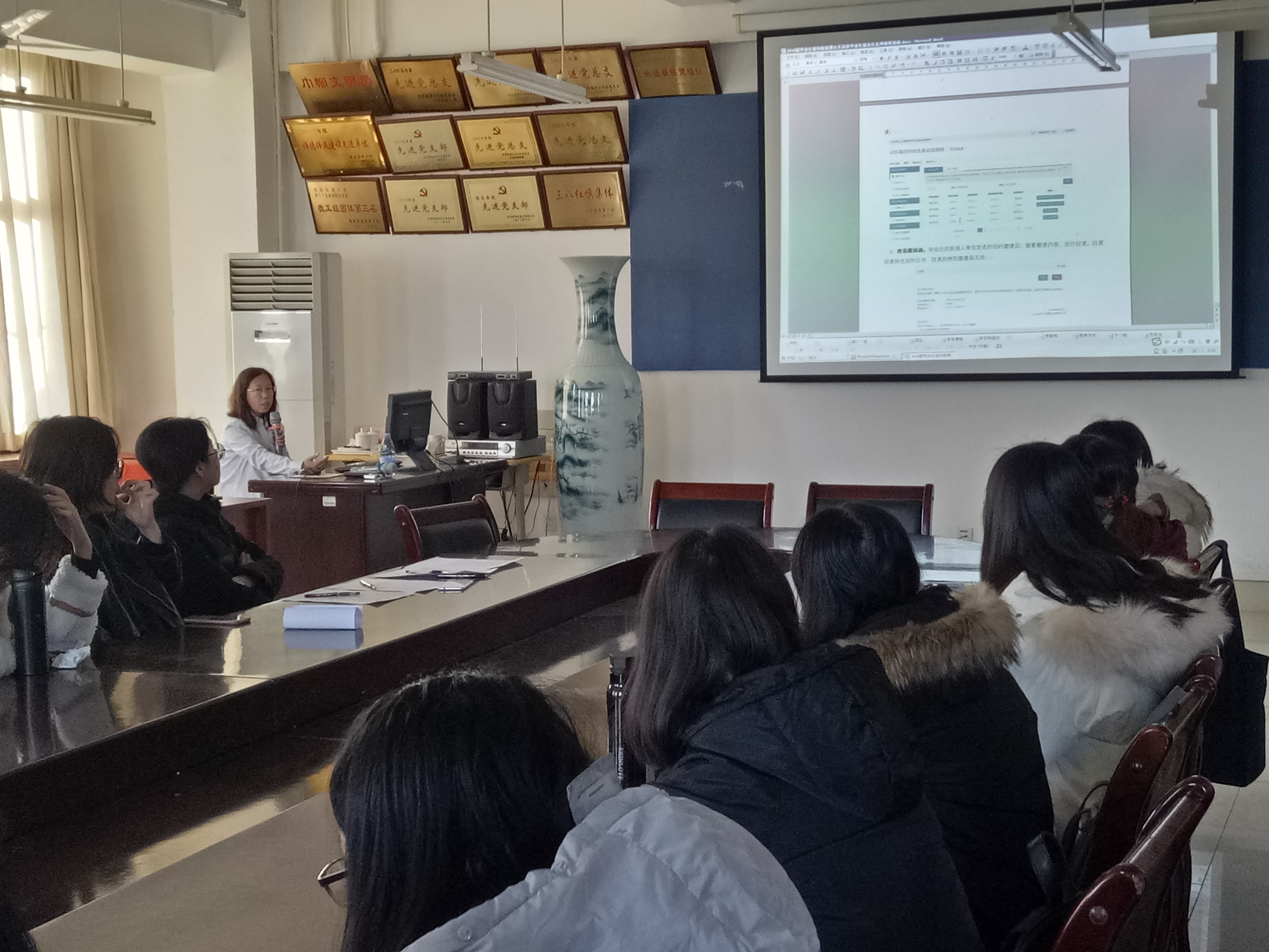 刘艳对毕业生签约和办理离校手续有关问题做了说明,重点讲解了山东省高校毕业生就业信息网网上签约的流程。同时,对实习就业、签订劳动合同、考研和出国留学注意事项做了说明,对可能遇到的问题有针对性地提供了解决方法。