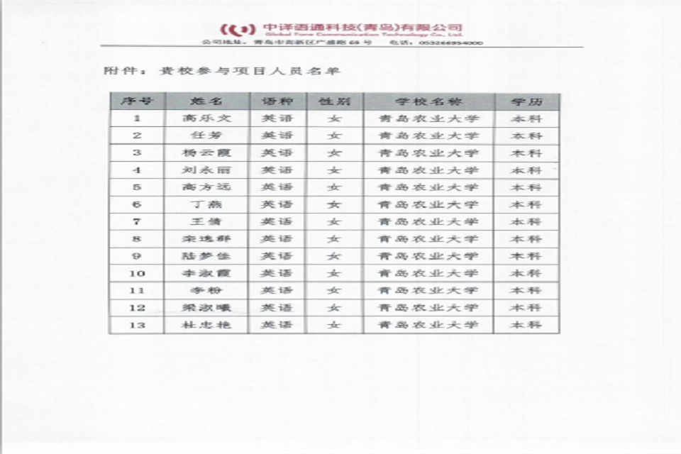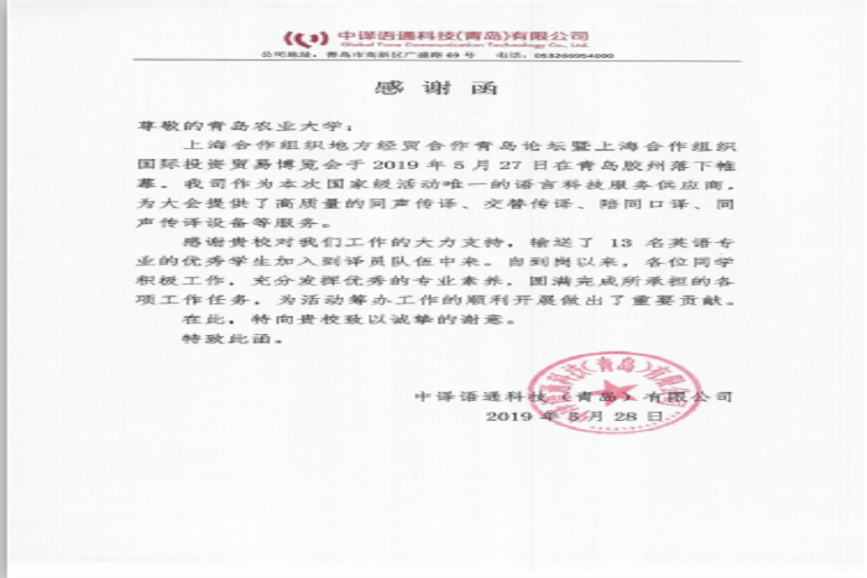近日,中译语通科技(青岛)有限公司向青岛农业大学外国语学院发来感谢函,感谢青岛农业大学外国语学院为上海合作组织地方经贸合作青岛论坛暨上海合作组织国际投资贸易博览会提供了高质量的志愿服务,为此次论坛和博览会的顺利开展做出重要贡献。