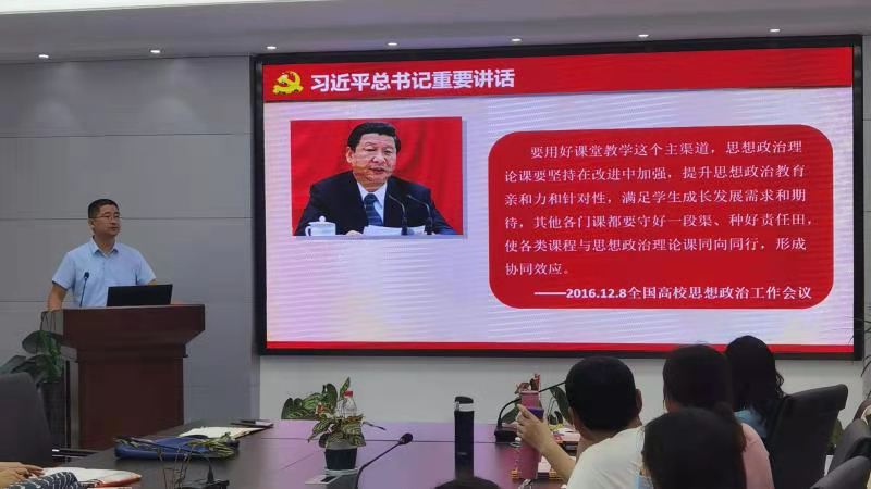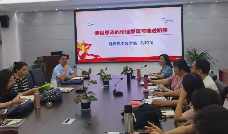 8月23日,外国语学院大学英语教研二室召开了“课程思政专题培训暨大学英语课程思政教学研讨会”。会议由教研室主任聂庆娟老师主持,特别邀请了马克思主义学院刘如飞副教授做报告,大学英语教研二室全体教师参加了会议。