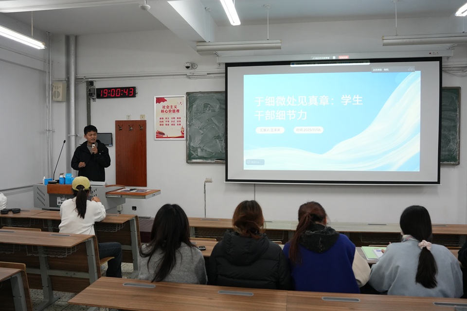 11月6日,外国语学院于教学楼C209举办2025—2026学年第三期青马骨干培训,副科级辅导员王洋洋主讲,全体学生骨干参加。