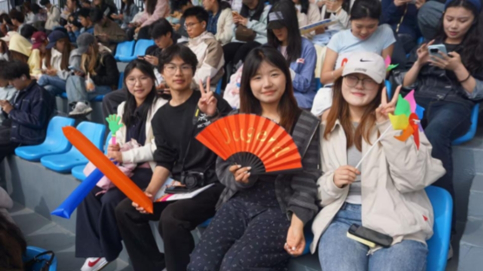 看台上,外国语学院的加油方阵热情洋溢。同学们挥舞着加油牌,“外语加油”的声浪此起彼伏,成为运动员最坚实的后盾。四名啦啦队队员红黑相间、闪亮登场,利落的舞步与动感的音乐交织,将赛场气氛一次次推向高潮。