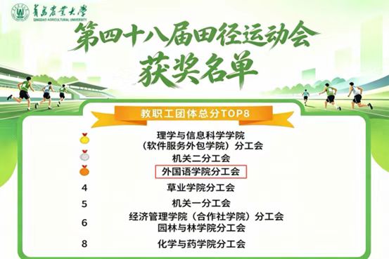 4月16日至17日,青岛农业大学第四十八届运动会在平度校区朝阳体育场火热举行。外国语学院师生踊跃参赛、奋力拼搏,最终斩获教工组团体总分第三名及体育道德风尚奖,为春日校园留下了一抹亮眼的“外语风采”。