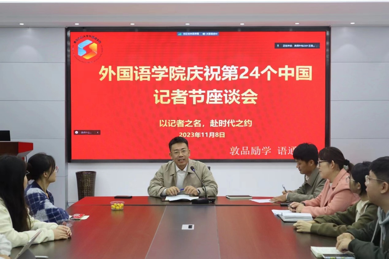 青岛农业大学外国语学院于11月8日在文经楼C220会议室召开庆祝第24个中国记者节座谈会。外国语学院党委副书记副院长盛金玉出席,辅导员王洋洋主持,学院辅导员张玉灵、学院学生会主席团、宣传部、新媒体中心、网络思政中心全体成员参加。