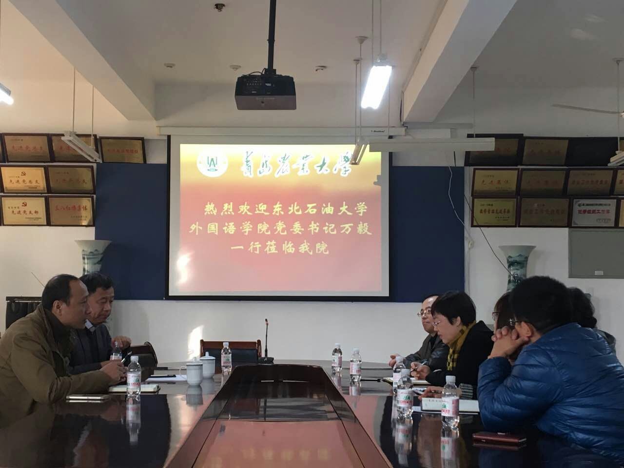 11月13号上午,东北石油大学外国语学院党委书记万毅、副院长乔洪亮来外国语学院调研交流。我院党委书记孙世孟、副院长纪卫宁、李春梅等在学院会议室与来访客人进行了深入座谈交流。