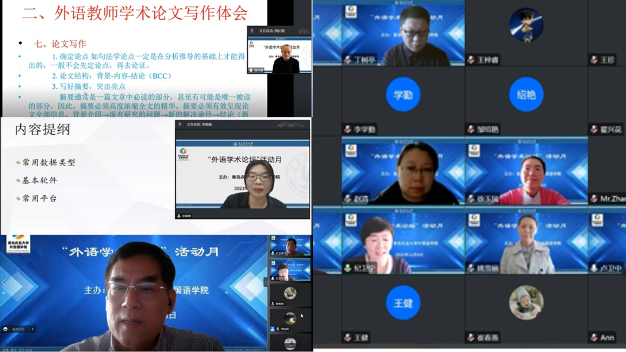 为进一步提升外国语学院专任教师的专业素养、学术素养,培养造就一支业务精湛、学术优良的教师队伍,紧跟学术前沿、优化学院学术资源,外国语学院于2022年11月开展“外语学术论坛”活动月,此次活动不仅邀请了北京第二外国语学院周长银教授、上海外国语大学语料库研究院助理研究员李晓倩博士和浙大城市学院卢卫中教授,还吸引了本院诸位教师的积极参与,共同分享学术研究成果。