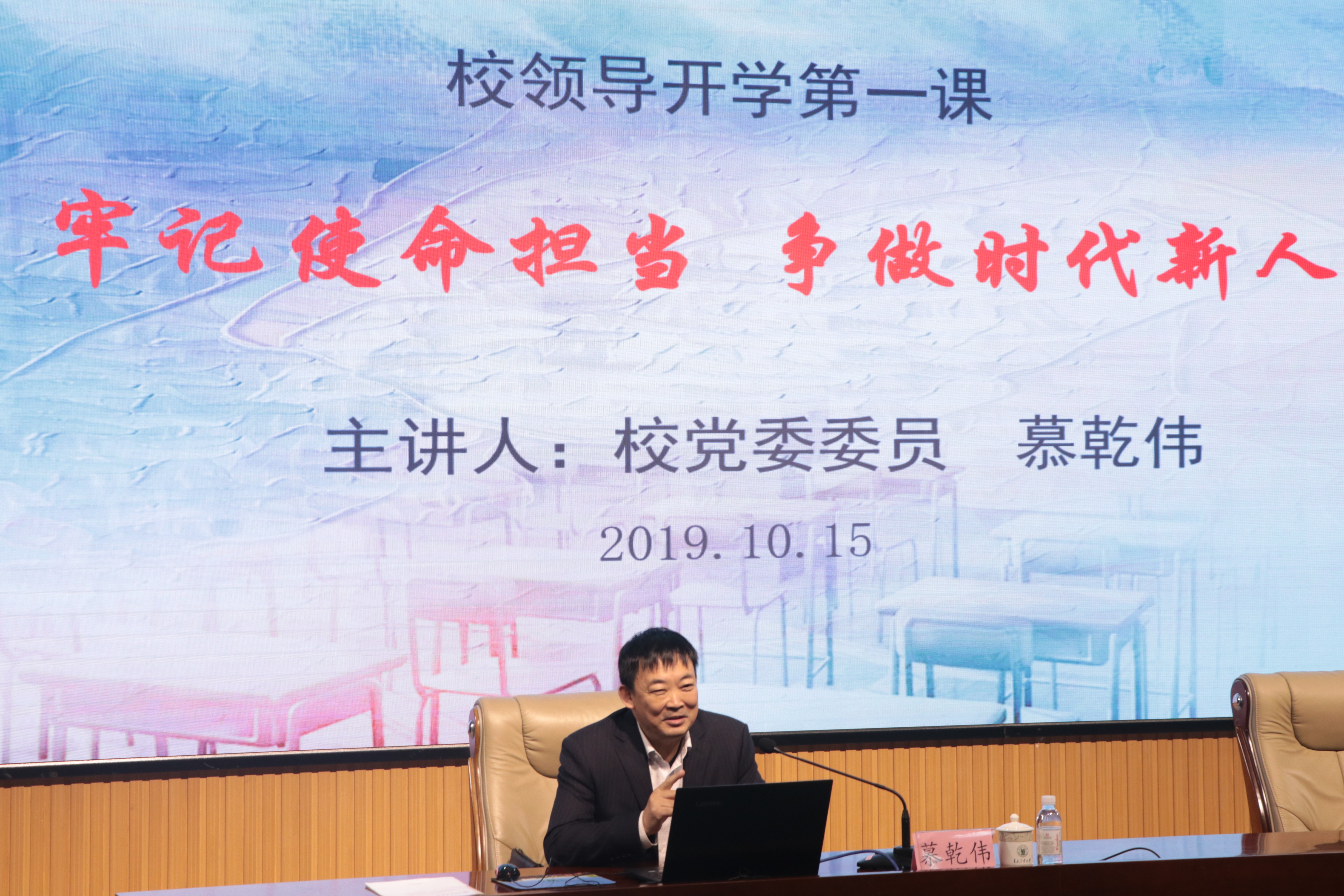慕乾伟以新中国成立70周年和正在开展的“不忘初心、牢记使命”主题教育导入,引导在座同学思考新时代青年大学生的使命担当。慕乾伟从为什么要上大学、大学的使命、大学生的责任、学校历史沿革概况和怎样度过大学生活五个方面阐述了大学生应当如何在自己的学习、工作和生活中担负起时代责任和历史使命,争做能够担当民族复兴大任的时代新人。他讲到,高校肩负着人才培养、科学研究、社会服务、文化传承创新、国际交流合作的重要使命,高校培养的学生肩负着将人类文明文化成果传承发扬、继承创新、进而服务国家和社会的时代责任;大学生要胸怀理想,把勤奋学习作为第一责任,通过学习知识和实践锻炼,成长为实现中华民族伟大复兴的生力军,在为实现中华民族伟大复兴而奋斗的历史进程中,放飞青春梦想,书写历史华章。